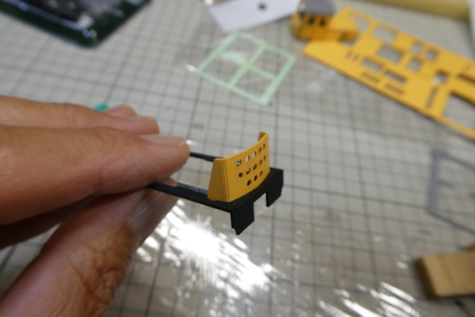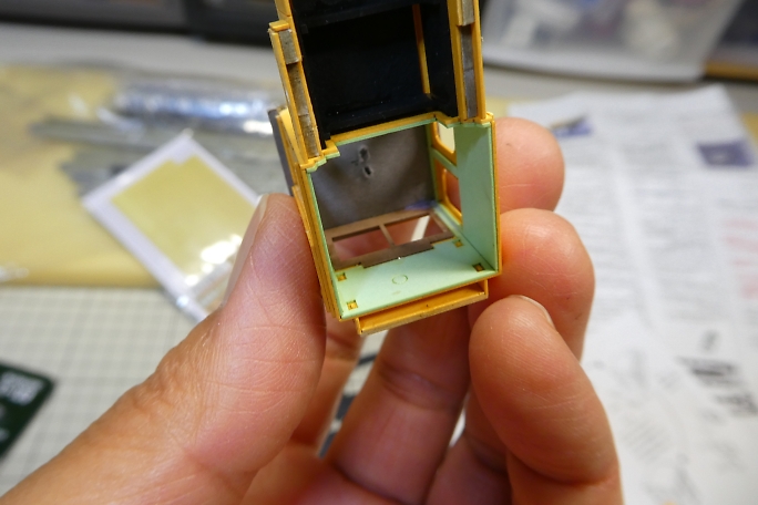 真鍮メッシュを貼ったラジエターパーツをボンネット前部に接着します。 ![]() 背面の箱部分になるパーツです。 同じ様ですが、微妙にサイズが異なっています。 ![]() 2枚を貼り合わせると、ペーパー1枚分の段差が出来る様になっています。 ![]() 背面の箱部分、横板になるパーツを先に接着します。 ![]() 先に接着した横板に段差の出来た背板パーツをはめ込む様に接着します。 この後に上面パーツを接着して蓋をすれば 完了です。 |