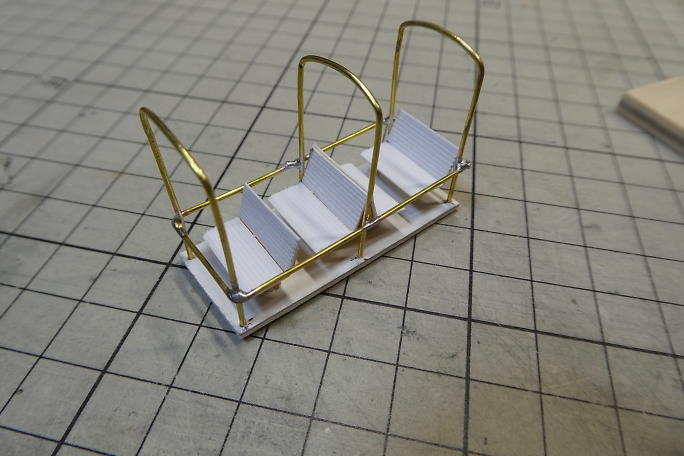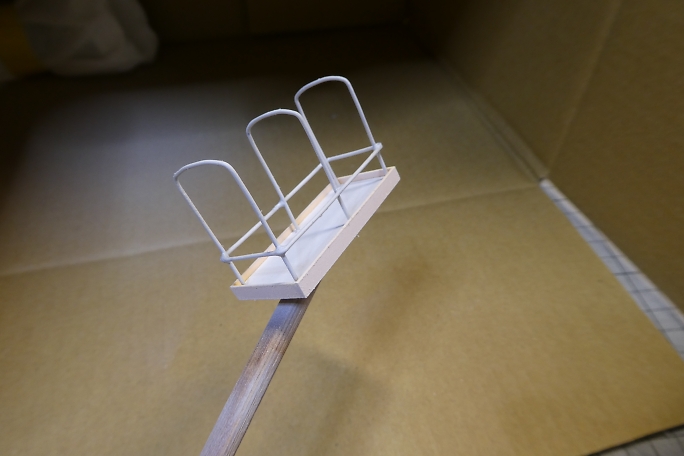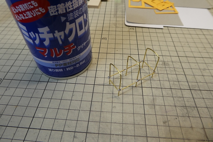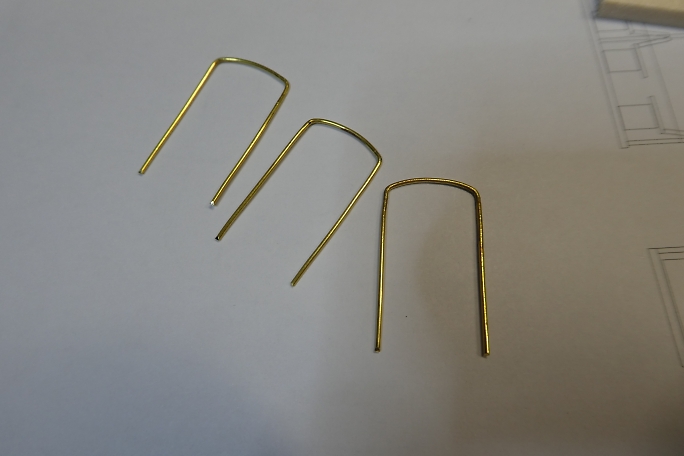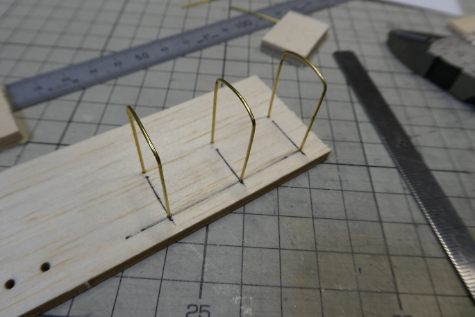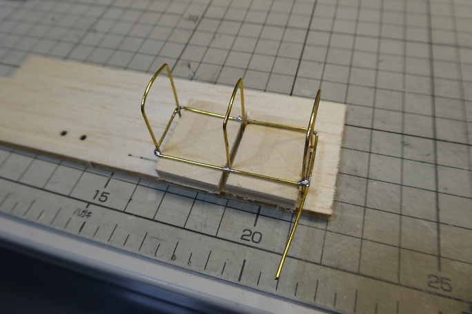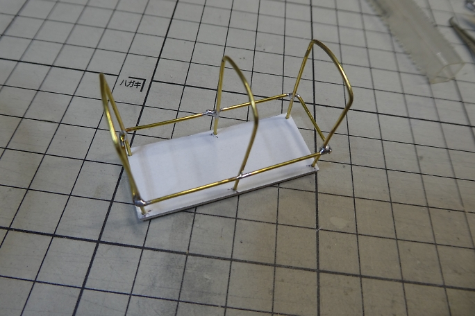 ![]() ![]() 幌の柱は0.9ミリの真鍮線です。 曲げ加工をした物を用意しました。 スクラップバルサに支柱を立てる位置に穴を開け 、ジグとして使用します。 ![]() 枠をハンダ付けで取り付けます。 ![]() ジグから取り外した幌です。 |