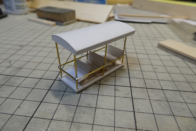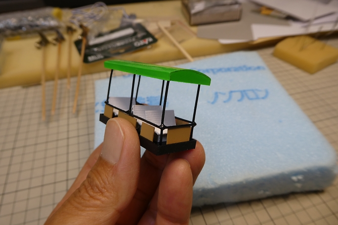 床板に幌を取り付ける穴を開けます。 ![]() 支柱を差し込んで瞬間接着剤で接着しました。 ![]() イスを仮置きしてみます。 ![]() 幌も被せてみます。 |