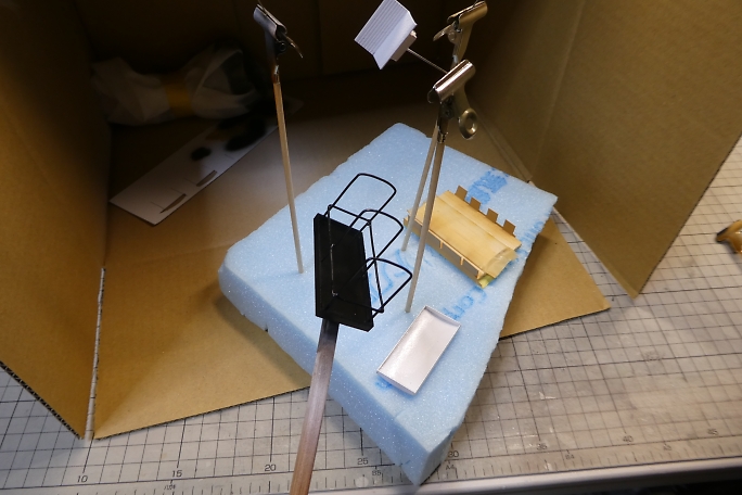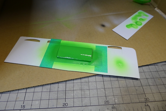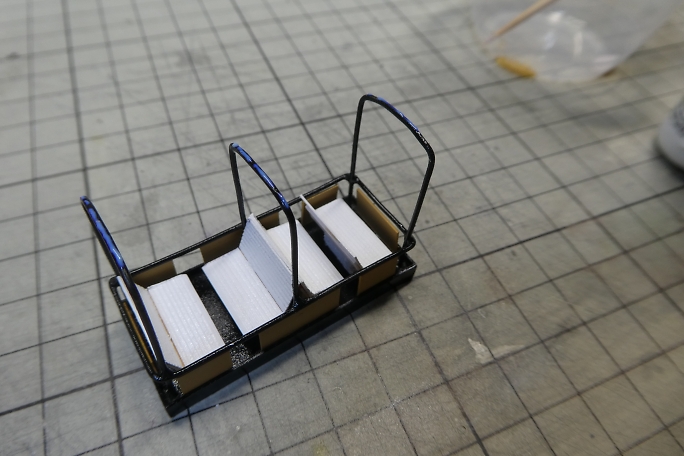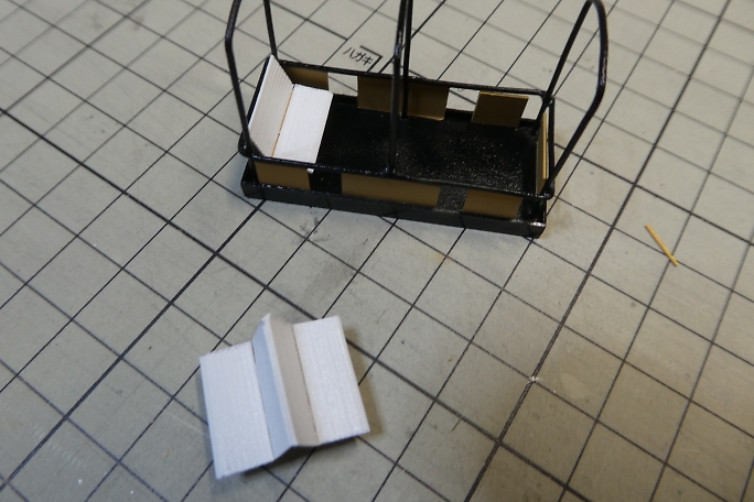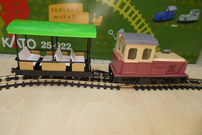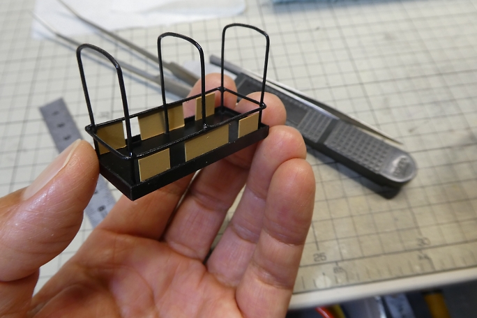![]() 真鍮製の幌の支柱は、プライマーとしてミッチャクロンを使用しました。 ![]() 下塗りに白サフを吹いておきます。 ![]() 各パーツの塗装を行います。 屋根は裏面が白で表が蛍光グリーンになりますが、この段階では裏面の白のみ塗って います。 ![]() 裏に塗料が回らない様にマスキングをして、上面に蛍光グリーンを塗装します。 ![]() 土台部分についたて板を接着します。 ![]() ![]() ベンチを接着します。 ![]() 屋根を接着すれば形になりました。 ![]() そのままでは急カーブが曲がれないので、連結器(カプラー)の延長パーツをカーボンロッドとカーボン板で作ります。 ![]() カプラー同士を延長パーツで繋ぎます。 ![]() トロッコ車体に台車を取り付けます。 台車はNゲージの貨車の台車部分です。 元の貨車の荷台を取り外して利用して います。 ![]() 完成です。 |
