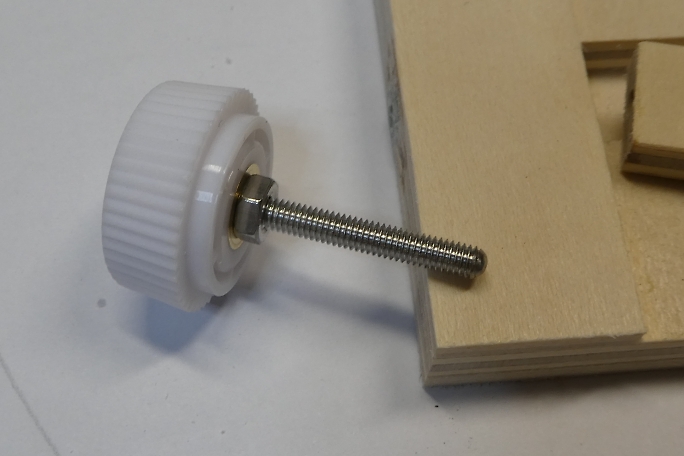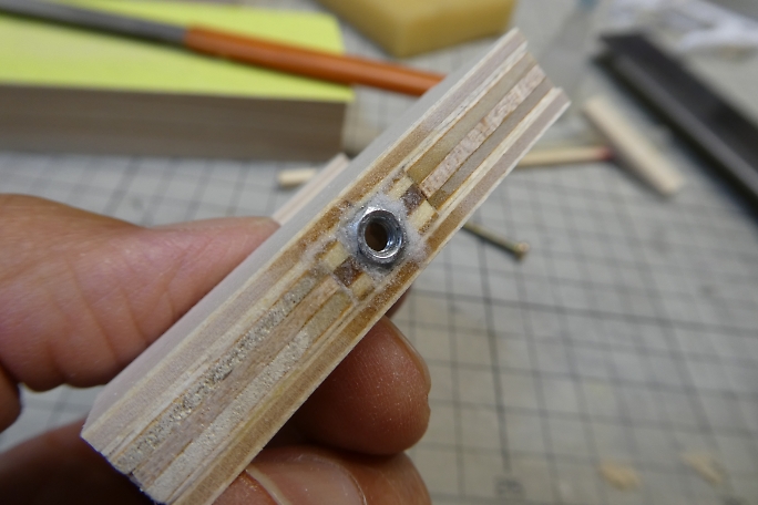 ![]() A4サイズのジオラマ、レイアウトを作って、機関車とトロッコを走らせようと考えました。 ただ、このサイズの既製品のカーブ レールがありません。 この手の手ジオラマを製作する時は、レールを自分の好きなカーブに曲げる「レールベンダー」と 言う物があるのですが、既製品を購入しようとすると数万円したりします。 にわか鉄道模型人なので、ここは自作することにします。 パーツを5ミリベニヤと3ミリベニヤからテーブルソーで切り出します。 ![]() 3ミリベニヤのベースに5ミリベニヤのガイドをタイトボンドで接着します。 右の物がすべり板で、溝を上下に移動します。 ![]() 3ミリベニヤですべり板が外れない為の押さえ板を接着します。 ![]() すべり板を上下させるボルトを保持するM3のナットを瞬間接着剤で接着します。 隙間にはマイクロバルーンを詰めて、 低粘度瞬間接着剤を垂らして固めます。 ![]() すべり板にはボルト受けのくぼみを付けます。 ![]() ![]() M3のステンレスボルトをすべり板の駆動用にします。 すべり板と接する面を丸め加工をします。 ボルトのネジ部分をカットして長ボルト状に加工します。 最初から長ボルトを使えば良かったと思いました。 ![]() ボルトにツマミを取り付けます。 ![]() 組み合わせて動きのチェックをします。 |