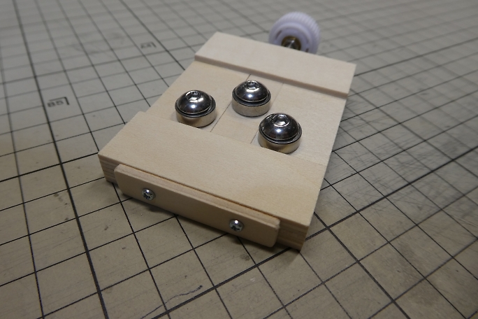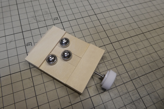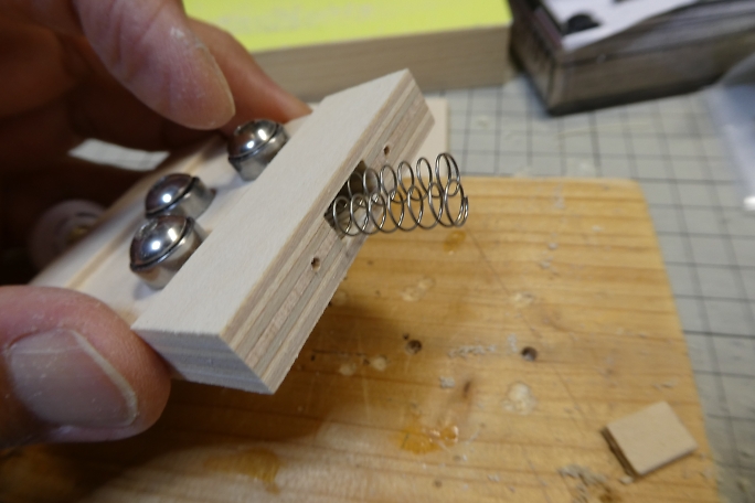 圧延ローラーになるベアリングを取り付けるネジ穴を開けます。 使用するベアリングは1150ベアリングで、ラジコンバギー 用の余りです。 M5のボルトを使用するので4.5ミリの下穴が開けてあります。 ![]() すべり板にもベアリング取り付け用の穴を開けます。 ![]() ベアリングを取り付けて形になりました。 ![]() すべり板の戻り用のスプリングを仕込みます。 ![]() 3ミリベニヤでスプリングの押さえを作り、取り付けます。 ![]() 駆動用ボルトを取り付けて完成です。 ![]() ベアリングにレールを挟み、ツマミで押し加減を調整しつつ、レールを左右に動かすとレールに曲がり癖が付きます。 ![]() この様に、図面に合わせたレールが作れます。 |