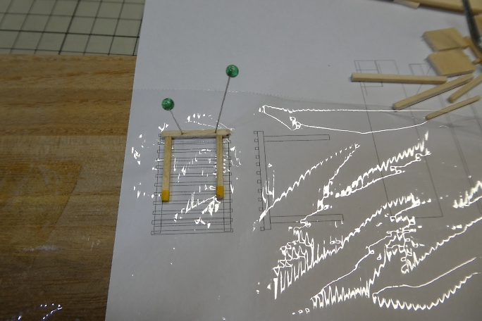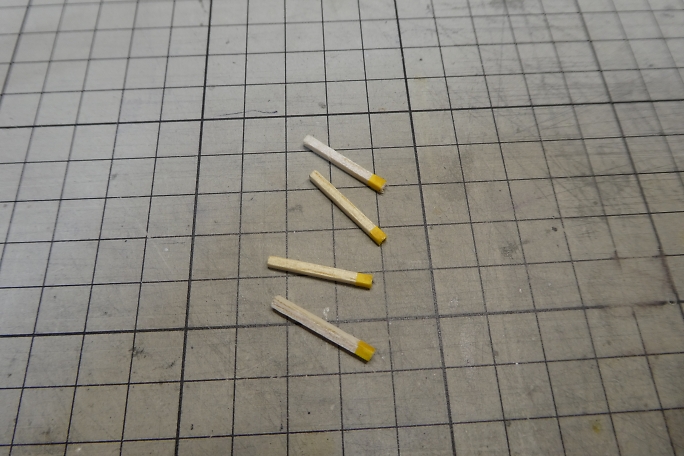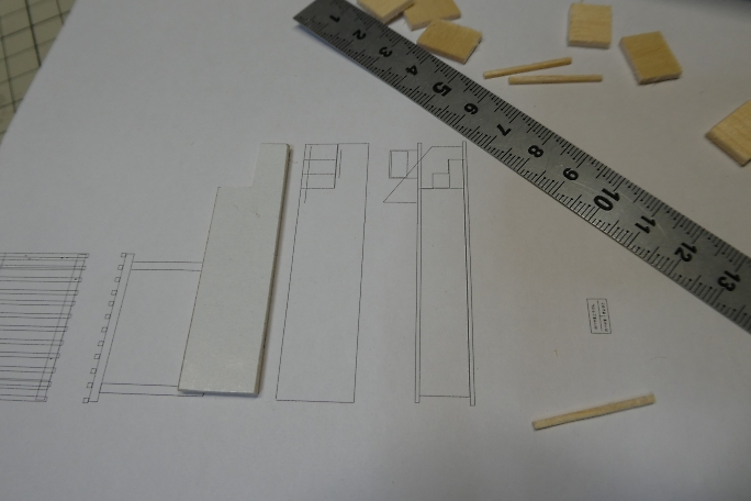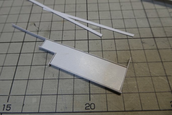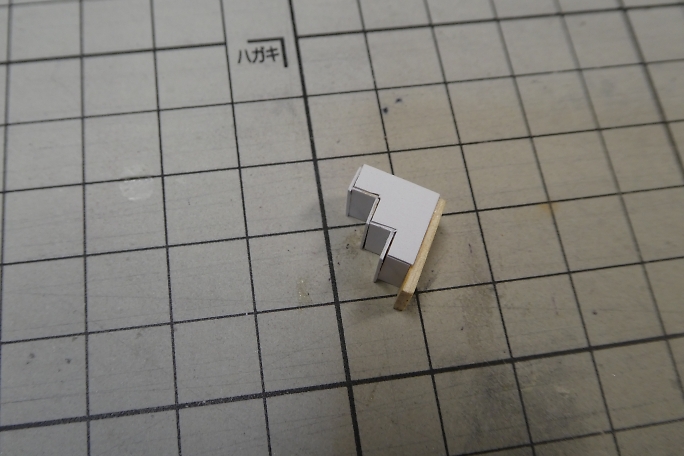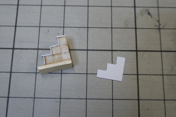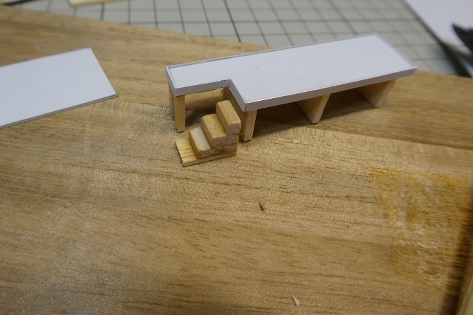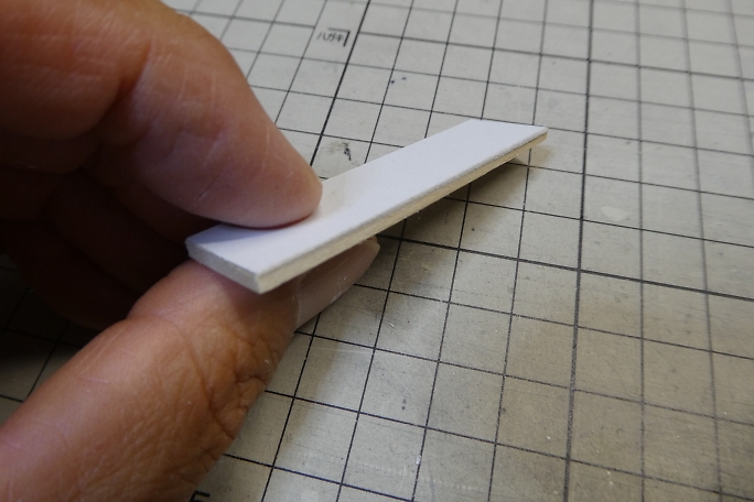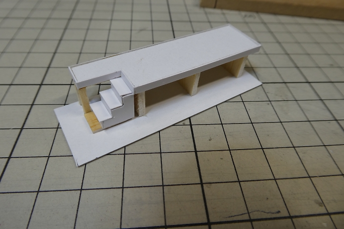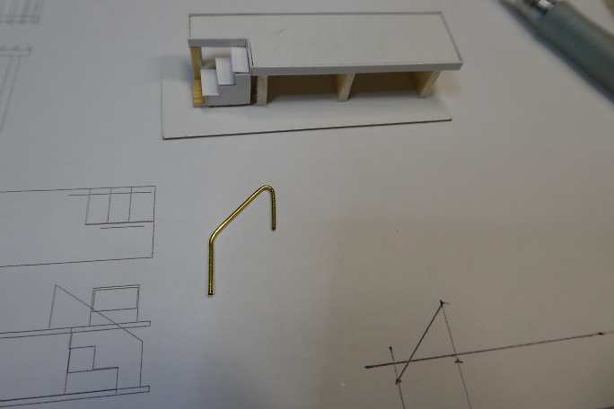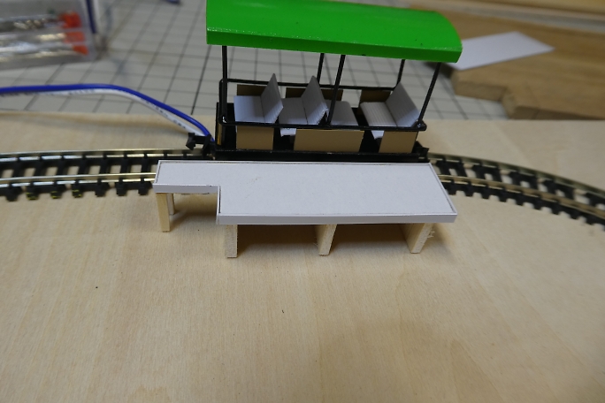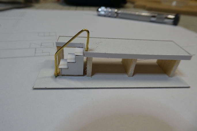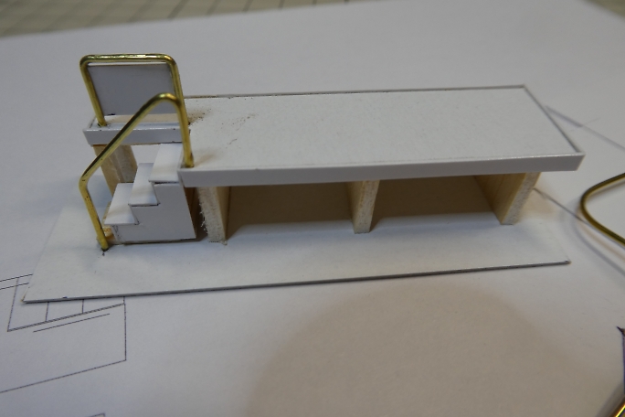 ホームの本体は切り出したバルサにボール紙を貼り合わせて作ります。 ![]() 階段の取り付けられる部分を切り欠きます。 ![]() 周囲を一周、細く切ったボール紙で覆い、縁を再現します。 ![]() 切り出したバルサの足を接着します。 ![]() 製作したトロッコを並べて、高さの確認をします。 丁度良いようです。 ![]() 2×2ミリバルサを積み上げて、階段を作りました。 ![]() ボール紙を貼って、ステップを作ります。 ![]() ![]() 側面のバルサ剥き出し部分に階段状に切ったボール紙を接着して目隠しにします。 ![]() ホームの形になりました。 ![]() 0.8ミリ真鍮線で手すりを作ります。 ![]() ホームと土台に穴を開けて、差し込み、接着します。 ![]() 曲げた0.8ミリ真鍮線にボール紙のプレートを接着して、案内板を作ります。 ![]() こちらもホームに穴を開けて差し込み、接着します。 |