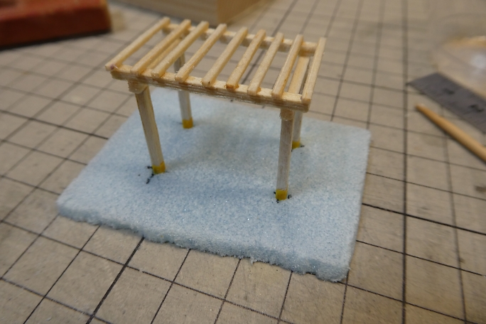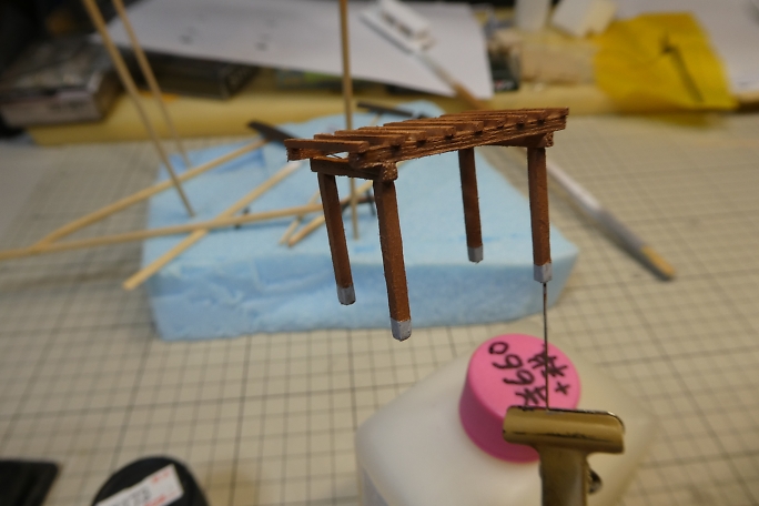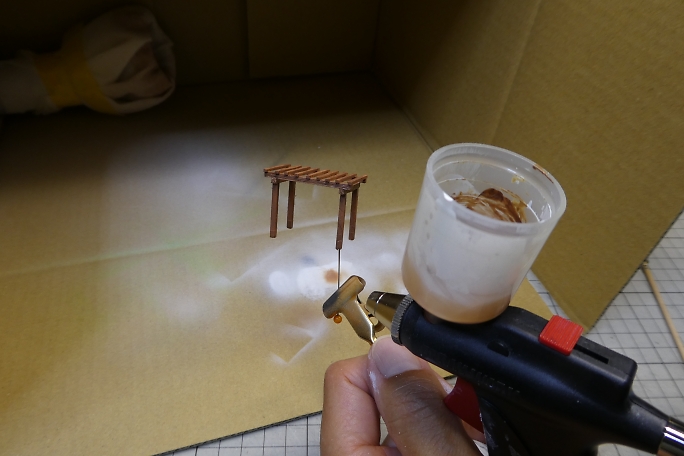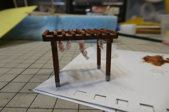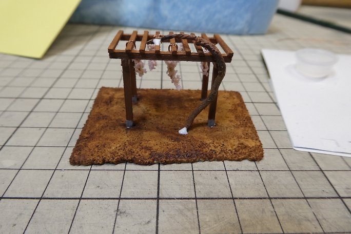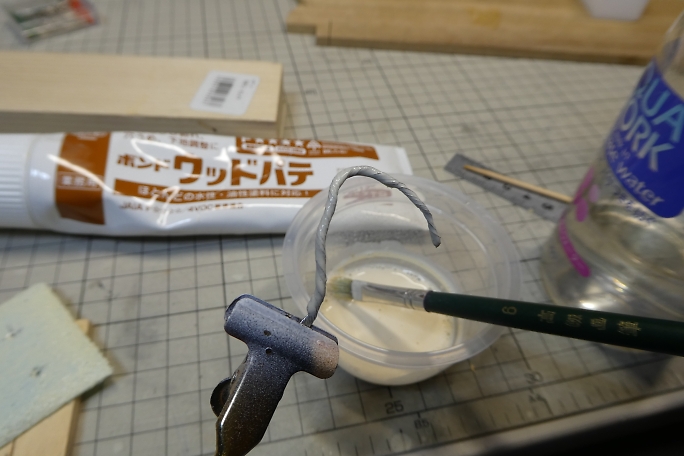 ![]() 無事だなの土台はスタイロフォームを3ミリ程度にスライスした物を用意しました。 ![]() 藤棚取り付け部分に穴を開けておきます。 ![]() ![]() 土台は土の感じを出したいので、下地に水溶きウッドパテを塗り重ねて目を消します。 ![]() 藤の幹は電線の芯線を撚って、「しな」付けて木っぽくなるようにします。 ![]() こちらも水溶きウッドパテを塗り重ねて撚った感じを消していきます。 |