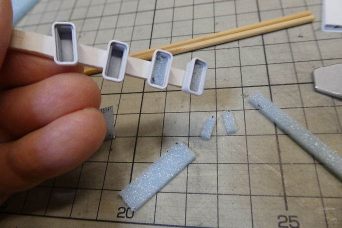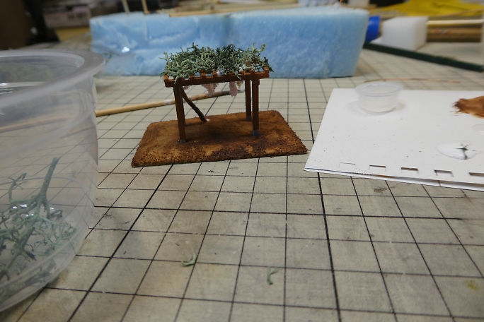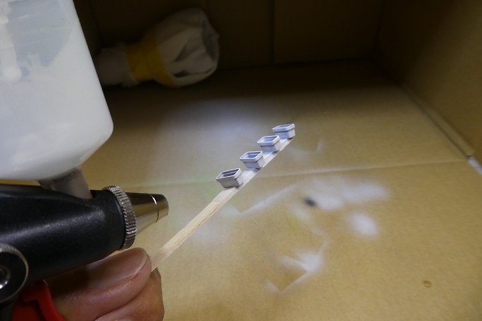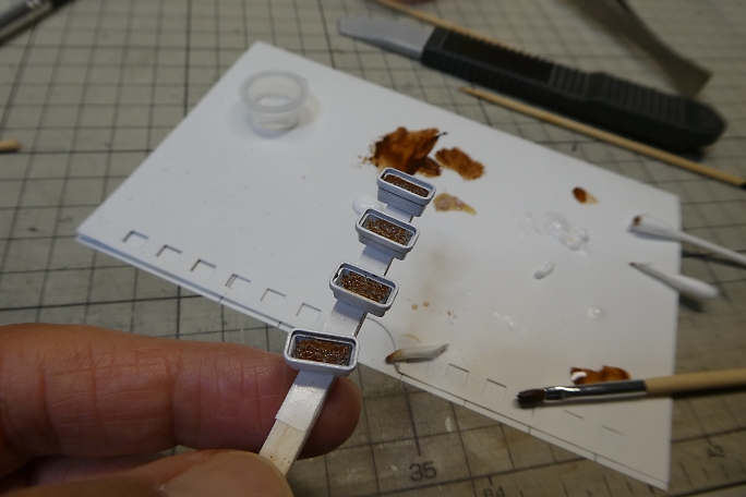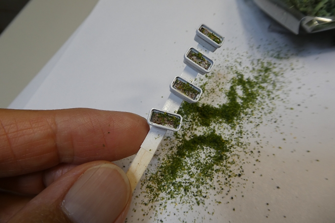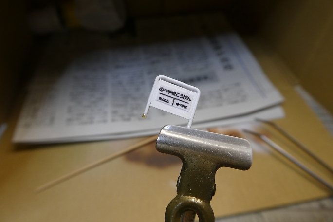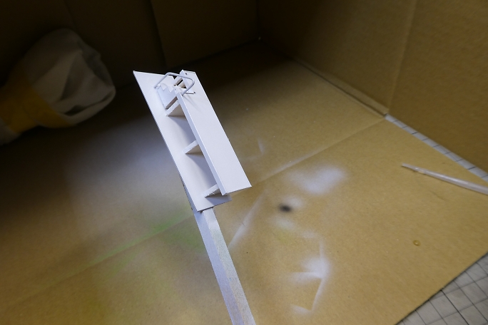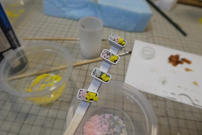 ![]() ストラクチャー部材にホワイトサフを吹いて下塗りとします。 ![]() 既製品のプランターです。 3Dプリンターパーツですが、良く再現されています。 ![]() サフを吹いた後、ホワイトで塗装しました。 ![]() 藤棚はブラウンとデザートイエローを適当に混ぜて吹き付けます。 ![]() 土台部分をグレーで塗り分けます。 ![]() パソコンで作った行き先板です。 滲んでしまっていますね。 紙の上からクリアラッカーを吹いて、水性インキを保護します。 ![]() 両面テープを貼った竹串に行き先板をそっと貼り付け、裏側にスプレー糊を吹き付けます。 ![]() 白く塗装したプレートに貼り付けて行き先案内板の完成です。 ![]() 0.28ミリの銅線に木工用ボンド盛ります。 ![]() ピンクのパウダーをまとわせて行きます。 ![]() 藤の花の完成です。 乾燥後、上下をひっくり返せば藤の花です。 ![]() 先端をJの字に曲げて、藤棚に取り付けらるように加工します。 ![]() 藤棚に位置関係を見ながら引っかけて、ボンドで固定します。 ![]() 土台に藤棚をボンドで接着、幹も接着します。 ![]() ジオラマ用の葉っぱを乗せて藤棚完成です。 ![]() 塗装の終わったプランターの底に土代わりのスタイロフォームを押し込みます。 ![]() アクリル絵の具の茶色でスタイロフォームを塗装します。 ![]() 水溶きボンドを茶色に塗装したプランターの土に塗り、グリーンのパウダーを振りかけます。 ![]() 白、ピンク、イエローのパウダーをボンドで接着しながらプランターを埋めて行きます。 パンジーっぽくなったでしょうか。 |