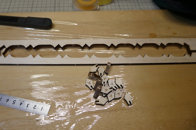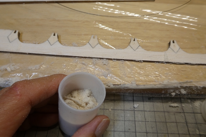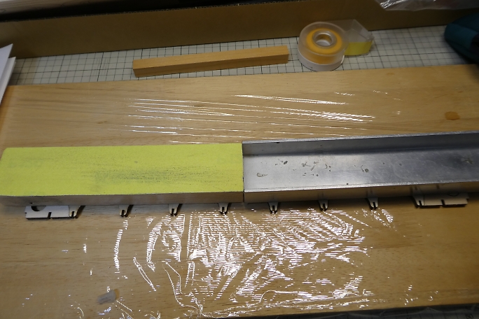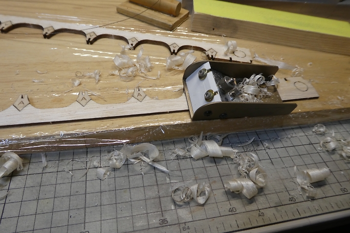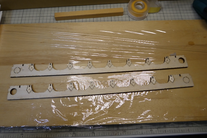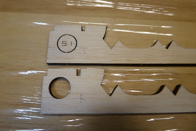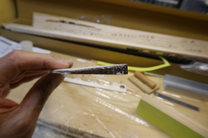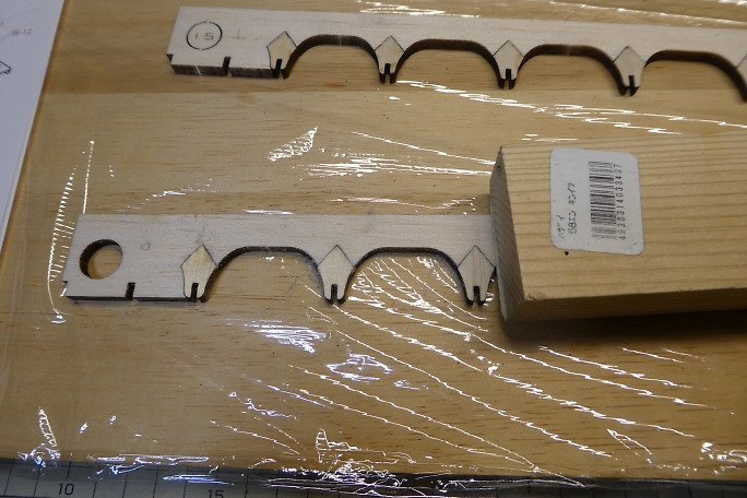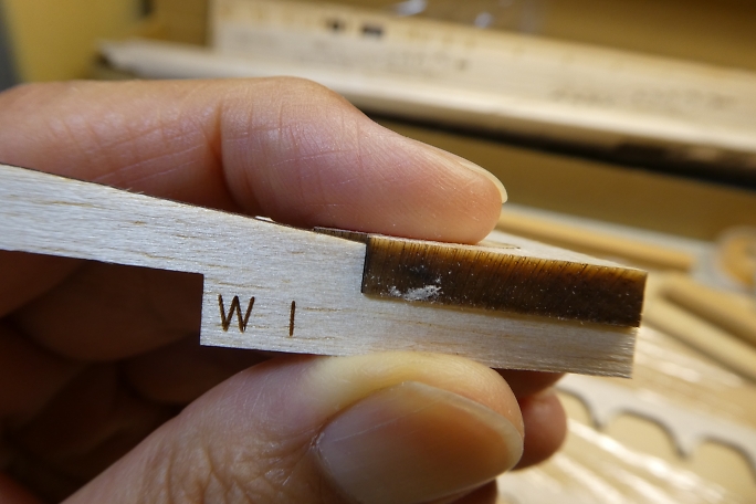 中央翼の後縁材とその周辺パーツです。 リブの後縁を受けるパーツは木目を変えるために別パーツとなっています。 ![]() 後縁材は左右があるので、鉛筆でチップとルートの識別を書き込んでおきました。 ![]() ![]() リブ受けパーツを切り出して、レーザーカットの足と焦げ目を削って整形しておきます。 ![]() ![]() 接着後、歪みが出て来るので、軽く重しを掛けて一晩放置します。 ![]() 後縁材の下面なる面をサンディングして平滑に仕上げておきます。 ![]() 後縁材を削るに当たって、どこまで削るかをリブを使って検討します。 前側も1ミリ弱削る必要があります。 ![]() バルサカンナで荒削りをします。 ![]() 更にサンディングボードで削って仕上げます。 バルサの粉が大量に出ますが、色々と利用価値があるので取っておきます。 ![]() 取説に後縁は1.5ミリ程度残し、9割程度の仕上がりで...とありましたので、従います。 |