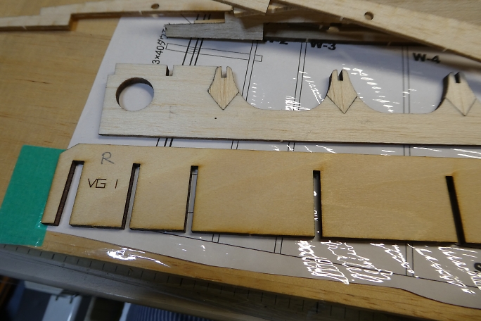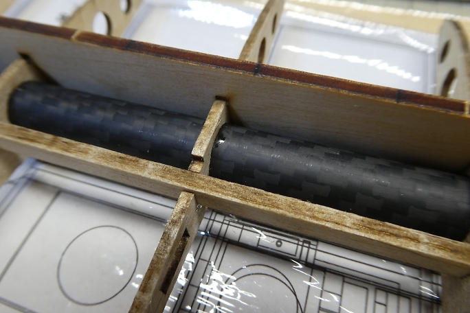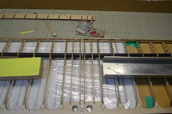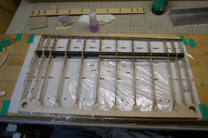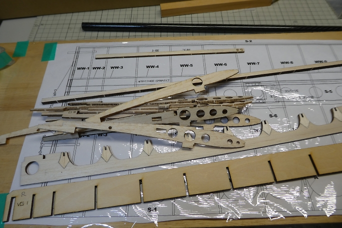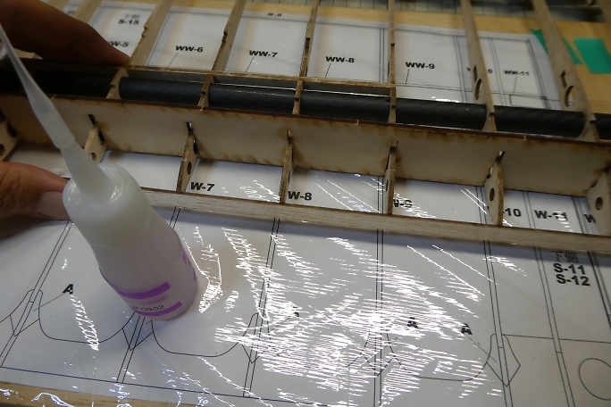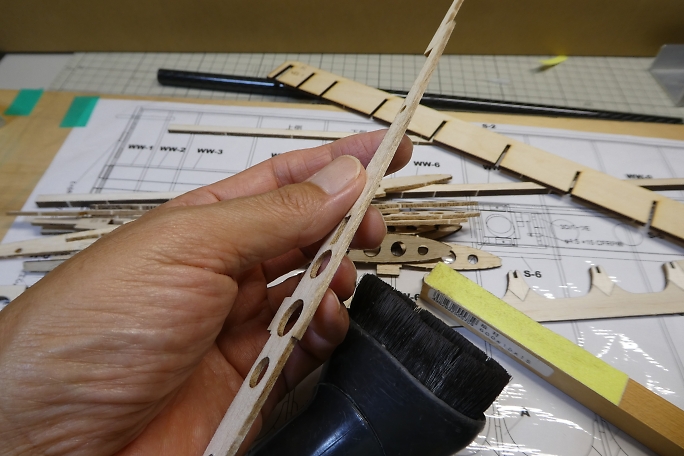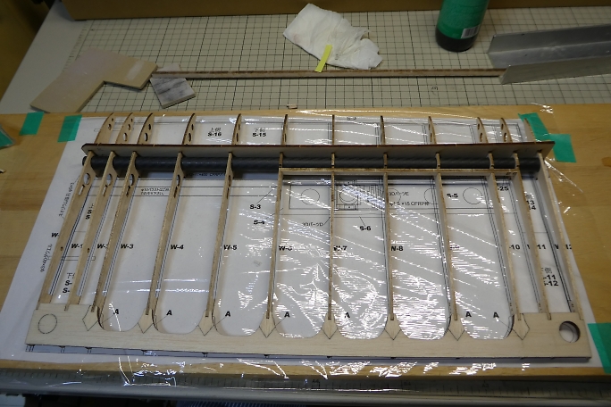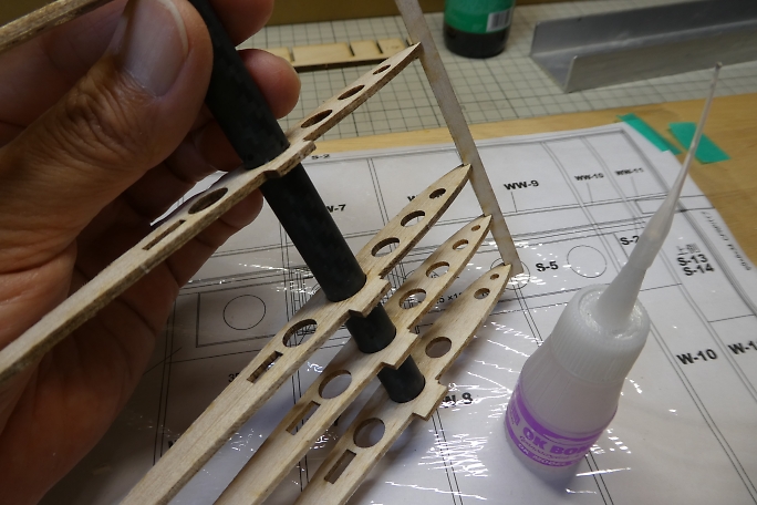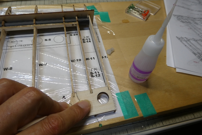 カーボンパイプにリブを通し、ジグで整列させます。 ジグの溝が渋くて、2枚ほどリブにヒビを入れてしまいました。 ジグの溝を平ヤスリで少し削って調整しました。 ![]() 図面上で仮組みをします。 リブをマチ針で定盤に固定します。 ![]() 低粘度瞬間接着剤一滴で仮接着をしていきます。 ![]() スパーも点付けで仮接着です。 ![]() ジグを付けた状態で前縁材も接着します。 前縁材はリブからはみ出す形で、内側にプランク材が入ります。 ![]() ジグを外して、カー本パイプの全周に低粘度瞬間接着剤を流します。 後縁材とリブもしっかり低粘度瞬間接着剤を 染みこませます。 ![]() 片側完成。 ![]() ![]() 両側が出来上がった所で、軽く重しを乗せて一晩放置して癖取りをします。 |