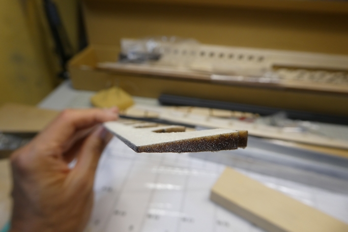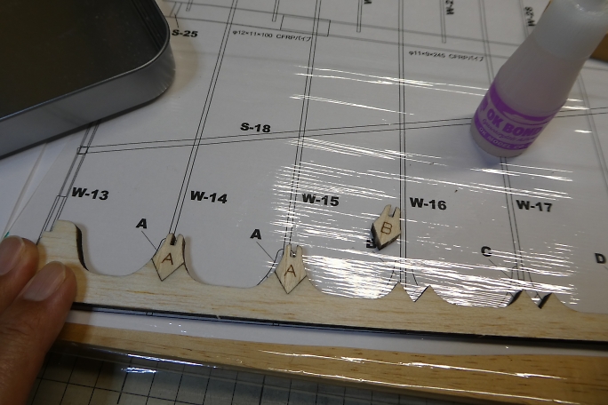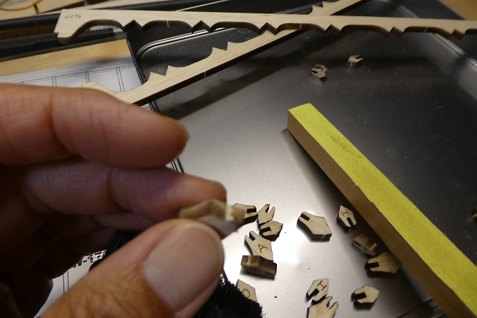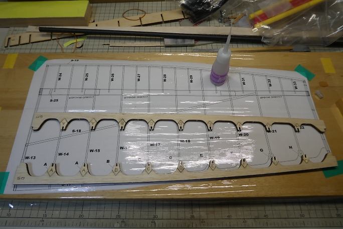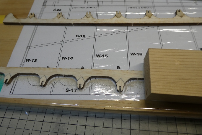 ![]() 二段目翼のリブ受けを切り出します。 レーザーカットの足や焦げ部分を削り落としておきます。 ![]() サイズが色々とあるので、間違えない様に図面と照らし合わせながら接着していきます。 ![]() 左右分接着完了です。 |