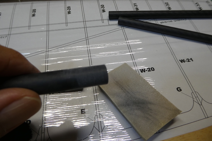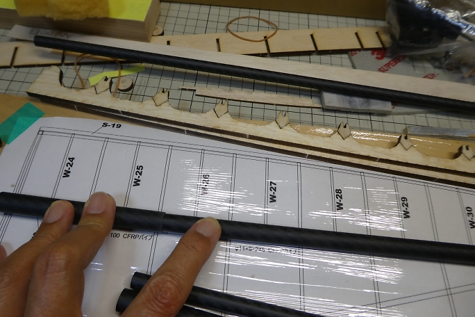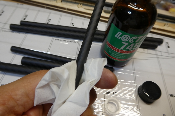 スパーは3種類の太さのカーボンパイプを繋ぎ合わせます。 ![]() カーボンパイプの角は落としておきます。 ![]() 繋ぎ合わせる部分はサンディングして足ツケをしておきます。 ![]() サンディングした部分を硬化促進剤で拭いておきます。 ロックタイトの745を使いました。 いつもはロックタイトの712 なのですが、切らしてしまったため代用です。 効果は似た感じですが、こちらは匂いがきついです。 ![]() カーボンパイプの内側は清掃を兼ねて硬化促進剤で拭いておきまます。 ![]() 図面に合わせて低粘度瞬間接着剤を繋ぎ目に染みこませて接着します。 ![]() 左右分のスパーが出来上がりました。 |
