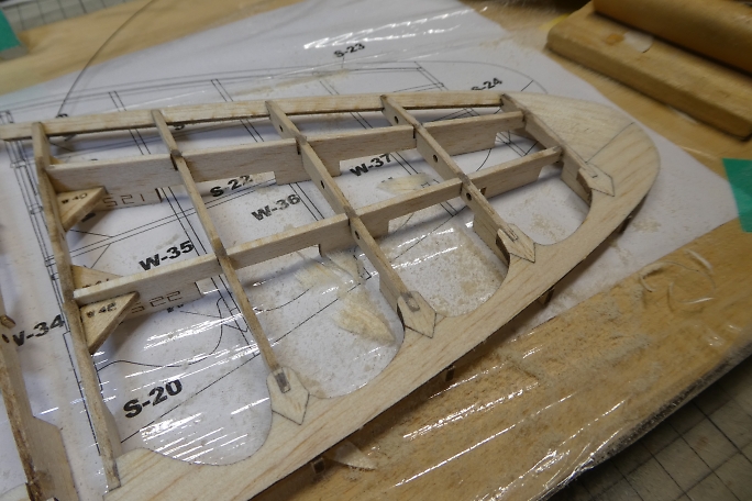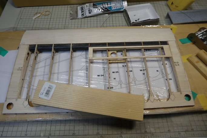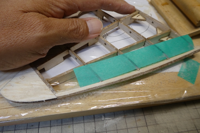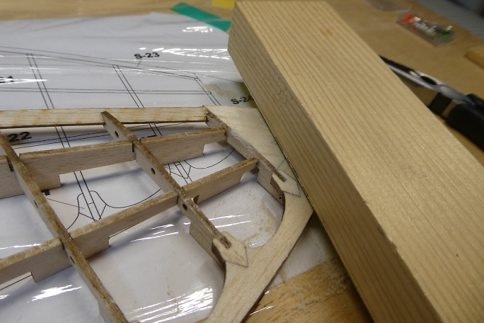 ![]() 下面は足が付いたままになっていて、上面作業の役に立ちます。 下面が安定している間に、上面を仕上げてしまいます。 三段目の翼端材を仕上げます。 リブを必要以上に削って仕舞わない様に注意します。 軽くサンディングして置いたレーザーカットの焦げ色の有無で均一感を感じ取るようにします。 ![]() 前縁材はリブをマスキングテープで保護をして削ります。 ![]() 8割に仕上げてあった後縁材もリブの焦げ目が無くなる程度にリブとの段差を取っていきます。 |