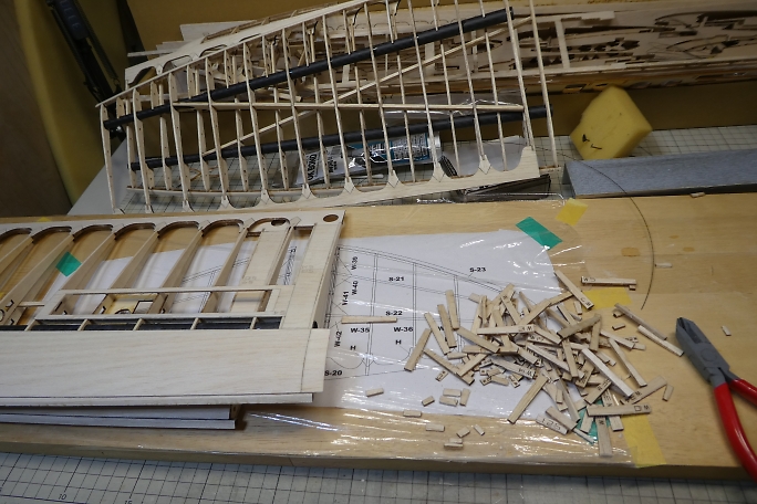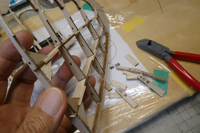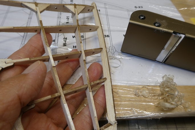 ![]() 裏面に残してあった足を取り除きます。 取説では「ニッパーなどで...」とあったので、比較的刃の薄いニッパーを使って 切り取ってみました。 サンディングをするには切り残りがすぎた感じですので、カッターなどで中仕上げをする必要がありそうです。 ![]() 三段目から始めて、慣れた所で二段目、一段目のリブの足を全て切り取りました。 かなりの量のスクラップバルサが出来 ました。 |