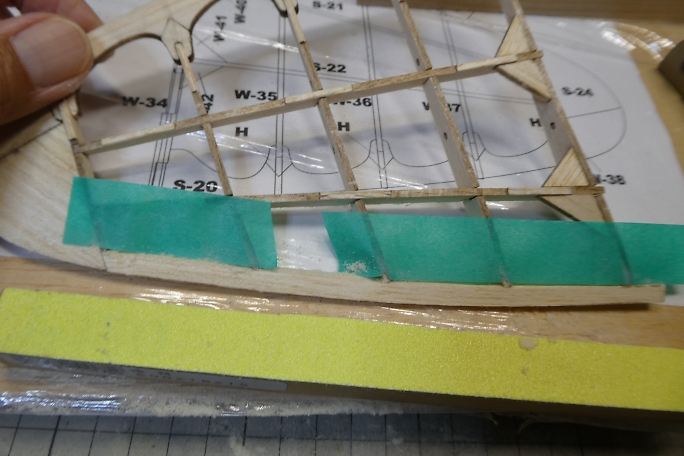 二段目もリブをマスキングテープで養生をして前縁を仕上げて行きます。 こちらもリブとの段差取りを優先しています。 ![]() 大きなサンディングブロックで波打たせない様にします。 ![]() リブの足の残り、後縁に掛けて焦げ目の無くなるのを目安に平滑に仕上げます。 |