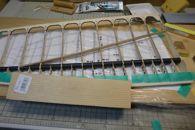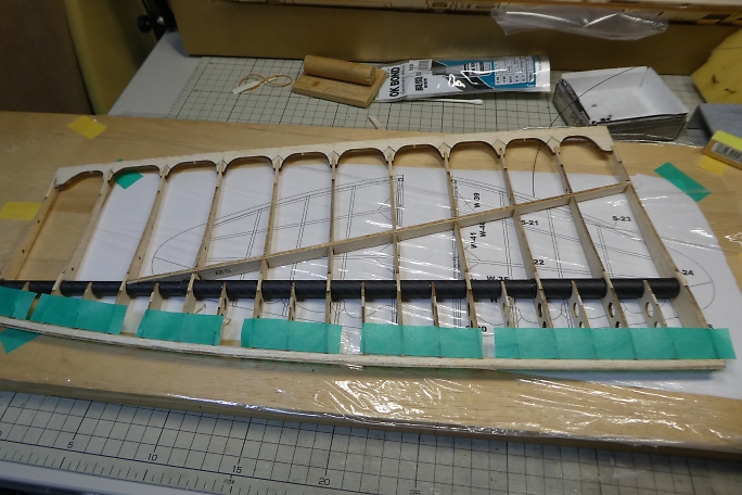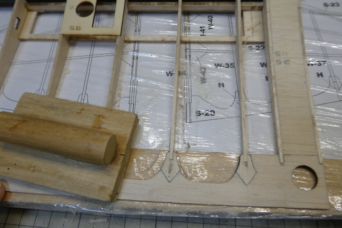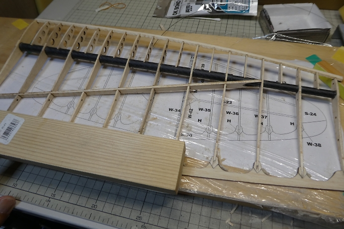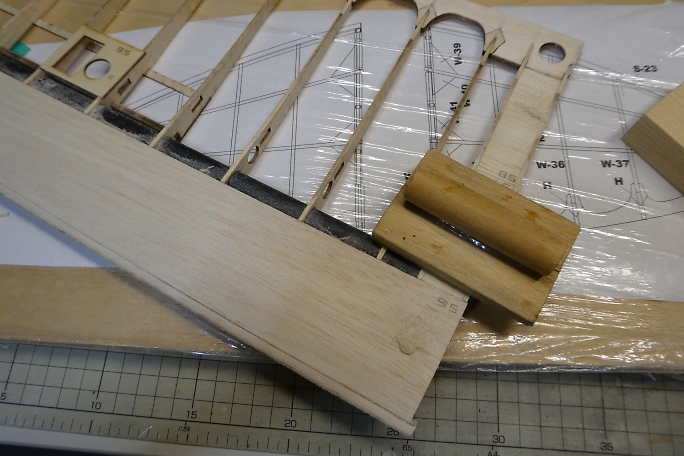 三段目の下面を仕上げます。 前縁材をバルサカンナで荒削りをしていきます。 ![]() リブを削らない様にマスキングテープで養生をして、サンディングして整えていきます。 全翼接合後に前縁は他の翼に 合わせて成型しますので、リブとの段差を取る程度にしておきます。 ![]() 残っていたリブの足を取り除き、、焦げ目が無くなるのを目安に全体を平滑に整えます。 |