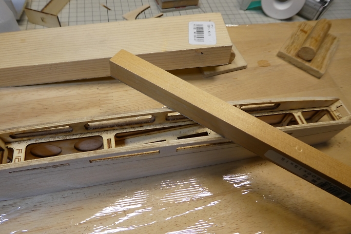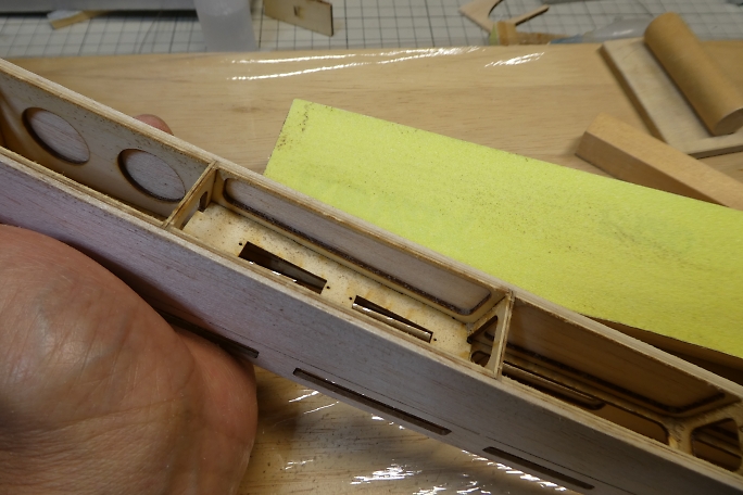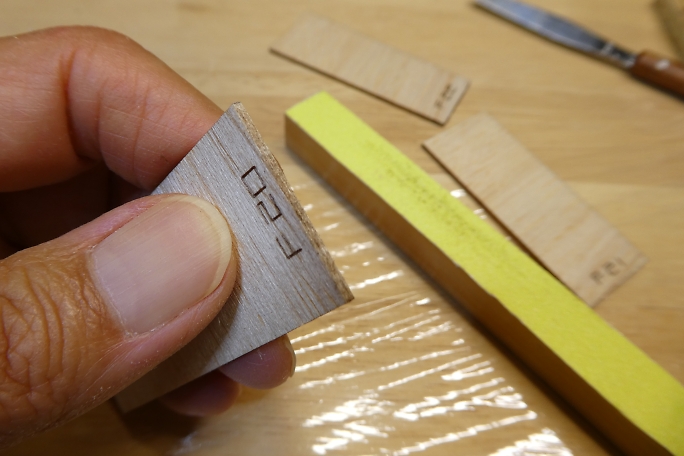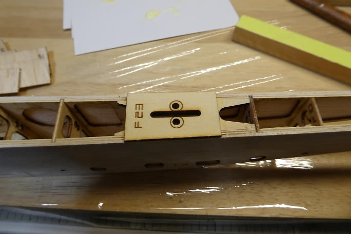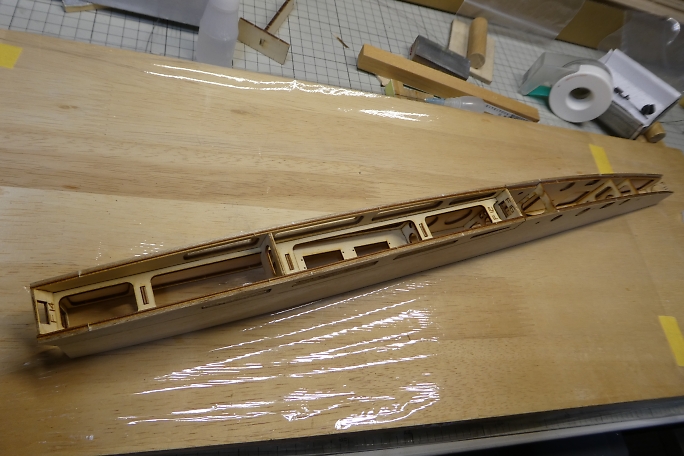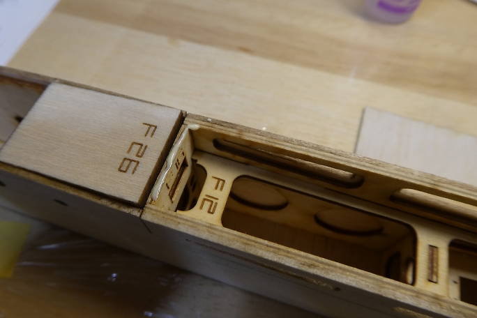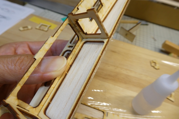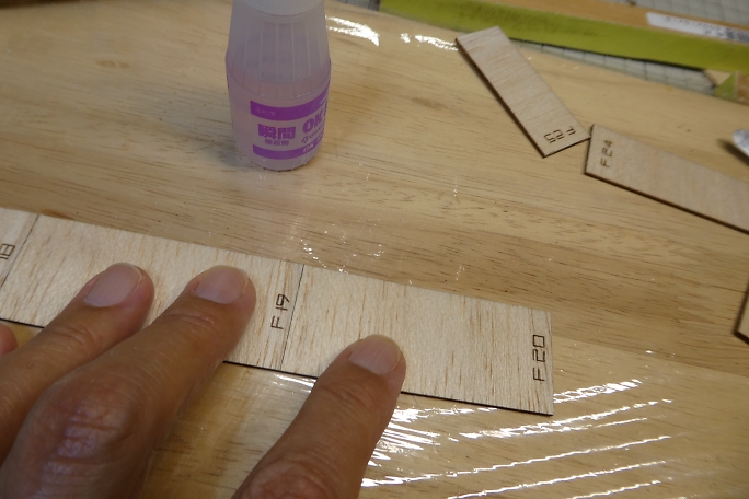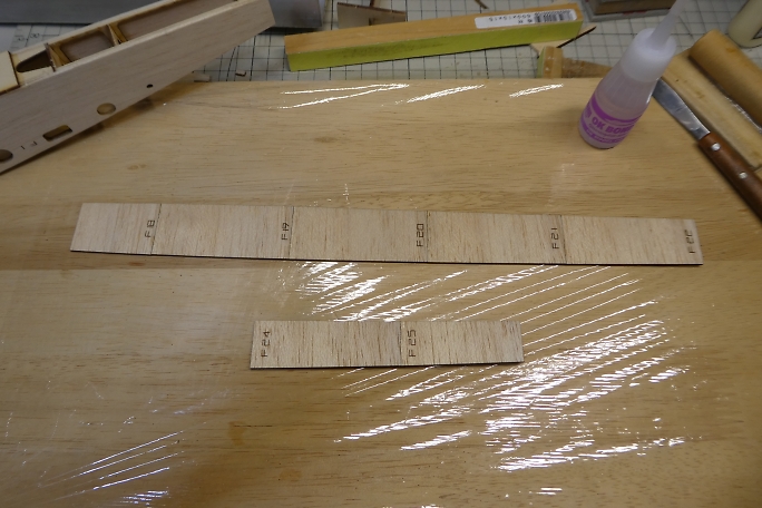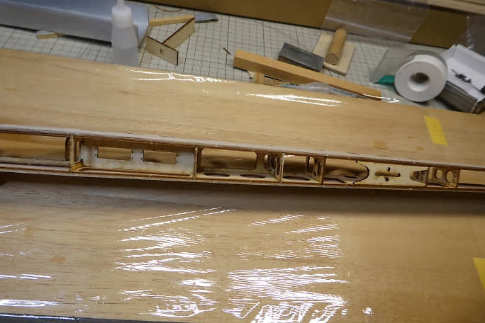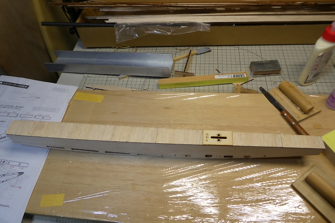 ![]() プランク材の接着面のレーザーカットの足と焦げを落としておきます。 ![]() 極少量の低粘度瞬間接着剤で接着します。 多く瞬間接着剤を付けてしまうと、後で成形する時に接着部が削れ残って 盛り上がってしまいます。 ![]() プランク材が整いました。 ![]() プランク材は位置決めをしたら、胴体内から瞬間接着剤を流して接着します。 下面のプランクが完了しました。 ![]() 上面プランクのキャノピー部後端の胴枠は、瞬間接着剤が流せない場所なので、この部分はタイトボンドを使用します。 ![]() 上面プランクが完了しました。 |
