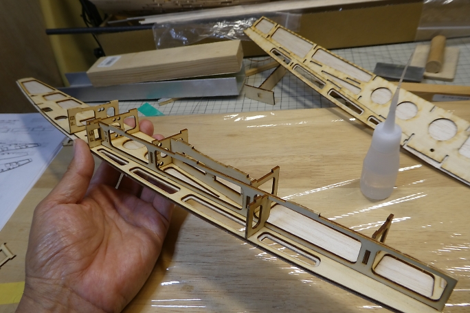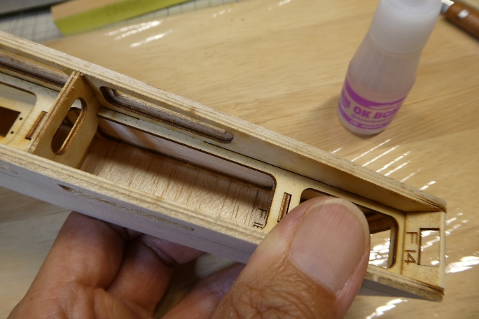 ![]() 片側に胴枠やフレームを組んでいきます。 フレームは下から瞬間接着剤を流さないと、後で切り離すキャノピーが 接着されてしまうので注意が必要です。 ![]() 片側の組み立てが終わりました。 組み立てはパズルの様ですので、先に接着してしまうと、入らなくなるパーツもあり ますので、一通りパーツを組み立ててから接着していく必要があります。 ![]() 胴枠と側板が全て接着し終わりました。 接着には主に中粘度瞬間接着剤を使用しています。 ![]() フック台を接着します。 側板の端面とツライチになるように位置決めをします。 ![]() ![]() プランクをする前に、接着面をサンディングします。 側板のバルサとフレームのベニヤが一緒に削れるようになる 所まで削ります。 |
