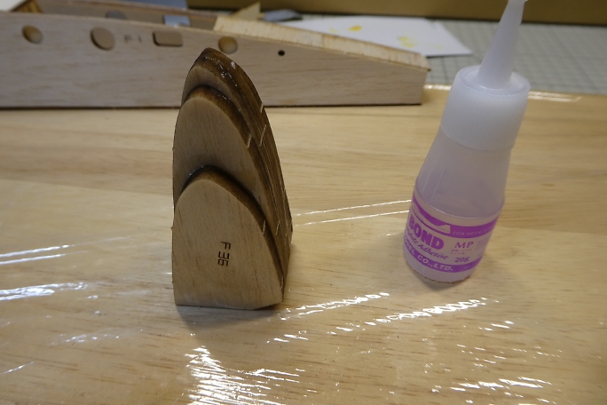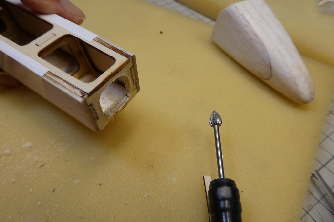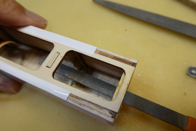 ![]() ノーズコーンのパーツを切り出します。 組み上がると中空になる仕様です。 パーツを貼り合わせるラインが刻印されて います。 ![]() 組み上げた状態で低粘度瞬間接着剤を流して接着します。 ![]() ノーズブロックを接着するために、胴体の前端を整形します。 ![]() ノーズブロックの接着面も平滑に整形します。 ![]() 製作時には全く気がつかなかったのですが、せっかく中空になっているノーズブロックに、重量物のバッテリーを入れる 事が出来ませんでした。 胴枠F3の開口部が狭く、手持ちのバッテリーが入らなかったのです。 ノーズブロックの接着面より明らかに幅が広い ので、削ってバッテリーに合わせる事が出来たのです。 ![]() ![]() ここまで広げてバッテリーがノーズブロックまで入れる事が出来ます。 最終的に10グラムの軽量化にもなりました。 ![]() ノーズブロックを胴体に合わせて、繋ぎ目に低粘度瞬間接着剤を流して接着します。 上面のキャノピーに接着してしまわない様に注意します。 この状態では、横と下側しか接着されていないので、キャノピーを切り離し後に上面の接着を忘れずに行います。 |