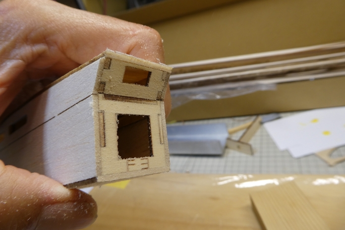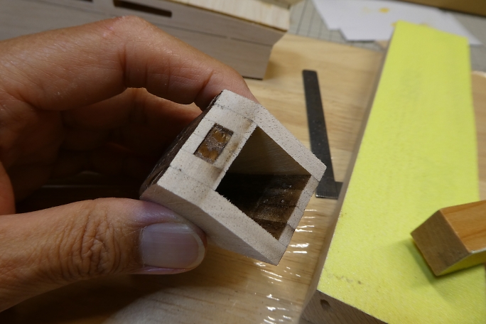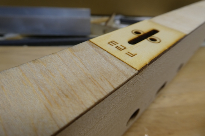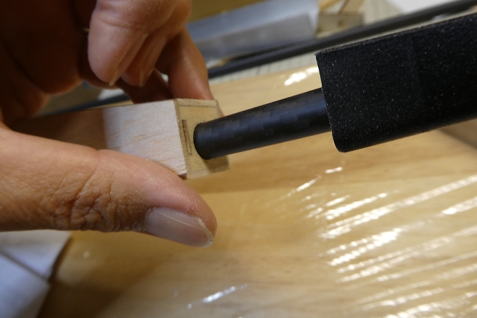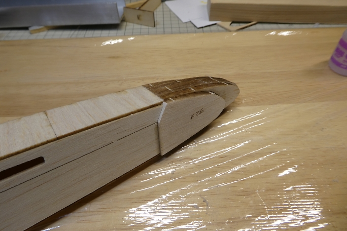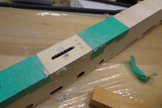 フック台のベニヤの板厚がプランク材より若干厚く、飛び出しています。 ![]() バルサのプランク材を削って仕舞わない様にマスキングテープで養生をして、ベニヤのフック台のみ削ります。 ![]() ツライチになるまで削ります。 |