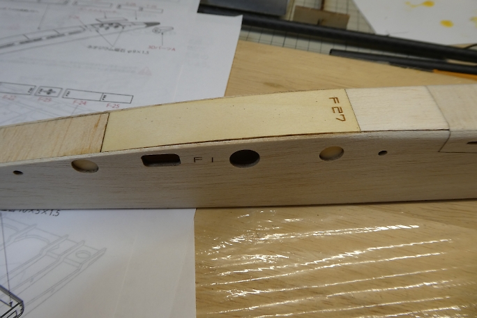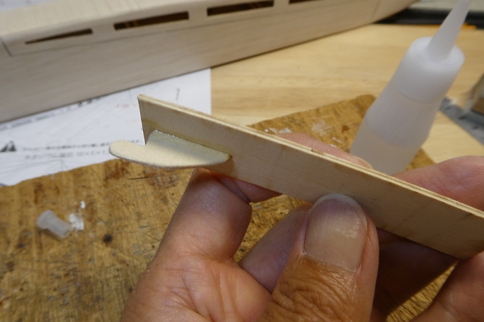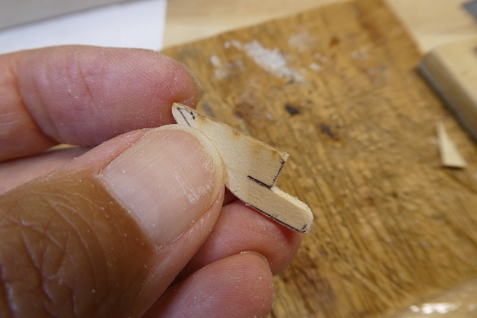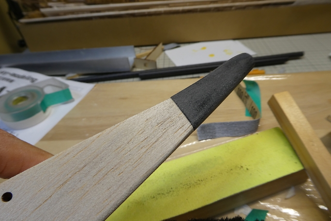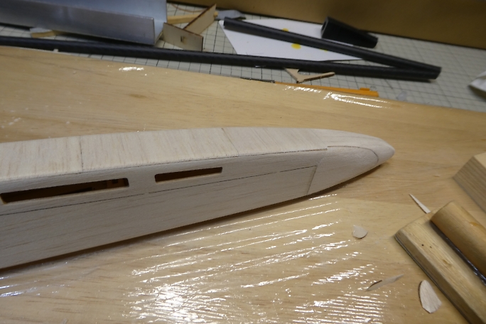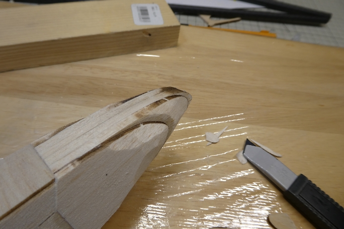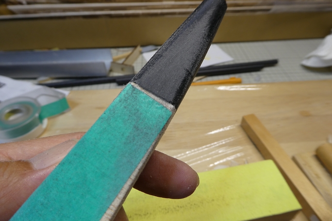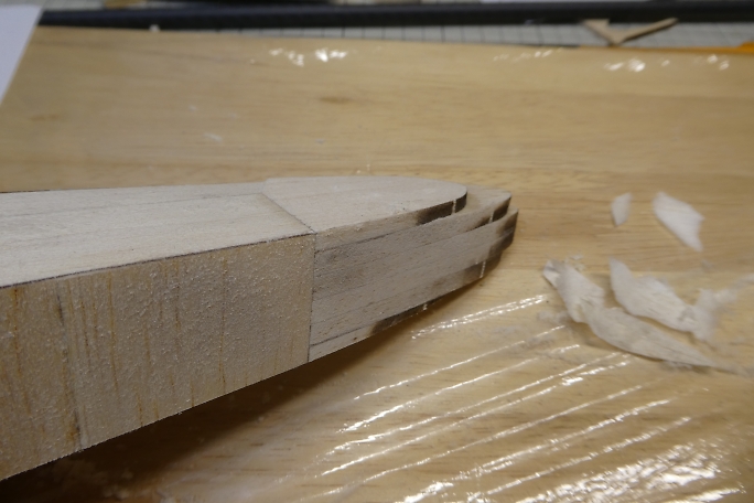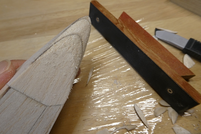 ![]() ノーズブロックの上下面をプランク材とツライチになるように削ります。 ![]() ノーズブロックの先端を整形します。 先ずはカッター鉛筆削りの要領で荒削りをします。 ![]() 鬼目ヤスリで大まかに削ります。 ![]() サンディングブロックで角を丸め、全体と繋がるように整形します。 |