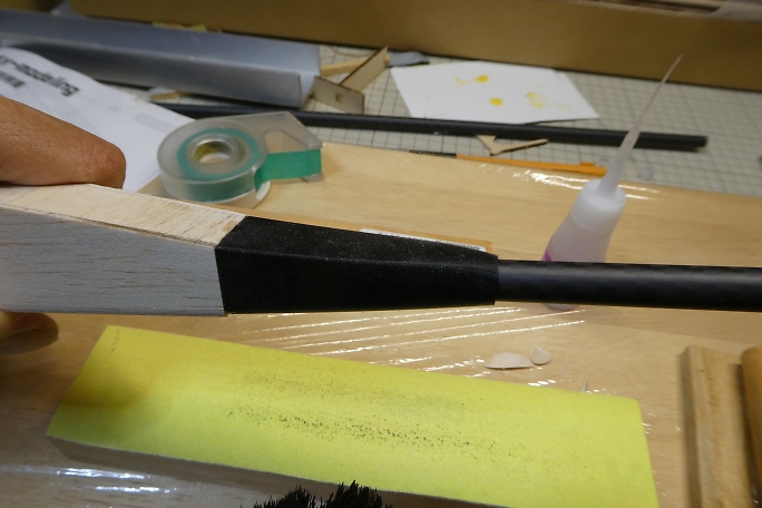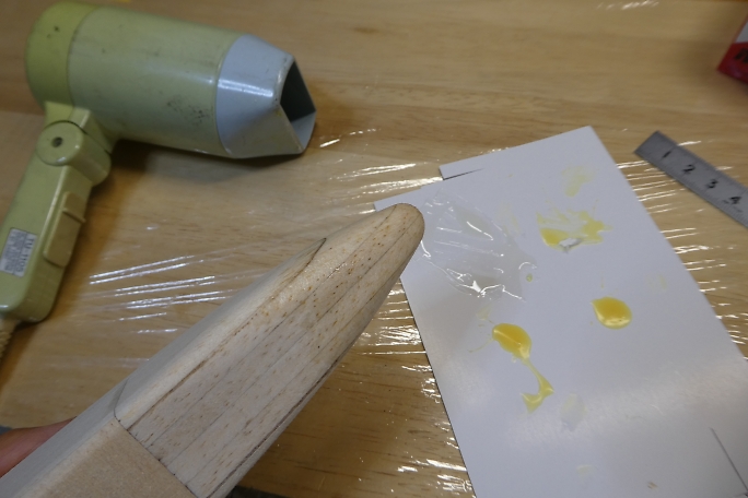 ![]() ノーズブロックは柔らかいバルサ製なので、着陸でへこむのを少しでも軽減するために、5分エポキシを染みこませて 硬化させます。 ![]() 塗りたくった後で、ドライヤーで加熱することで5分エポキシをノーズブロックのバルサ目に染みこませます。 |