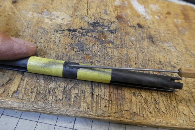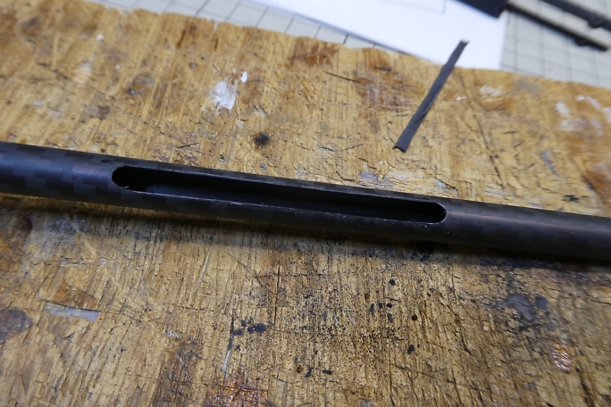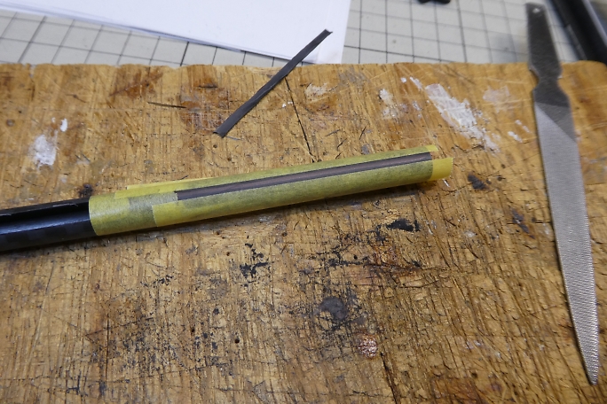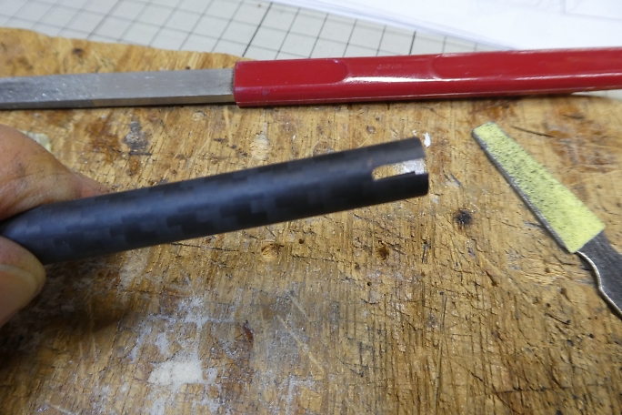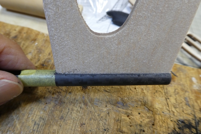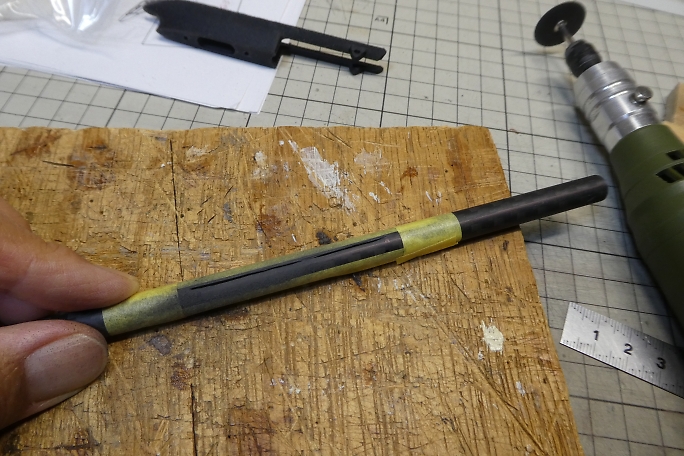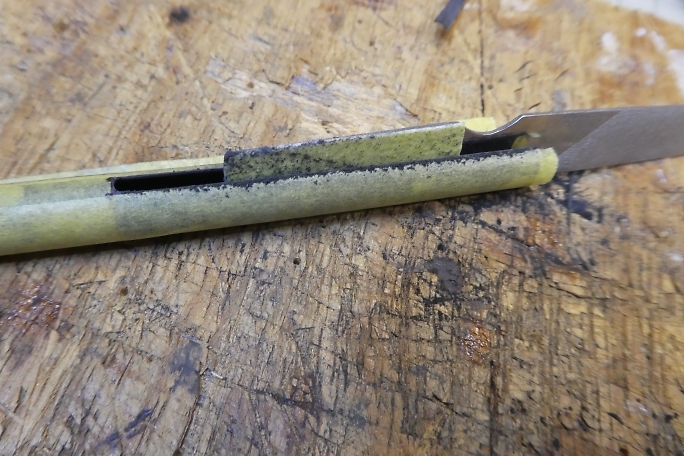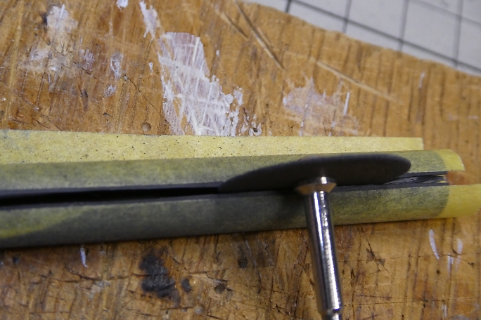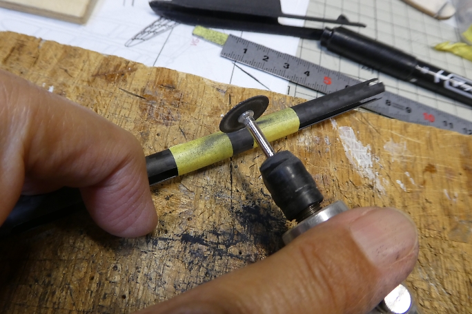 ![]() テールブームに水平尾翼パイロン下になるリンケージ用の取り出し口を加工します。 図面を参考にマスキングテープ で切り取り部をマーキング、リューターの切削砥石で切り開きます。 ![]() 切り取った跡を、ヤスリで整形します。 ![]() 垂直尾翼の取り付け部をマスキングテープでマーキングします。 先ほど開けたリンケージ取り出し口と同軸上に なります。 ![]() ![]() ![]() リューターの切削砥石で切り開き、垂直尾翼が無理なく入る様にヤスリで仕上げます。 ![]() ![]() ラダーホーンの逃げも図面を参考にマーキングして切り開き、整形します。 ![]() ラダーリンケージワイヤーの取り出し口を図面を参考に切り開きます。 使い切り寸前の径の小さくなった切削砥石 で幅は砥石の幅、長さ8ミリで穴を開けます。 ![]() 精密ヤスリで開けた穴を斜めに整形します。 ![]() 整形の終わったラダーリンケージ穴です。 左右に開けます。 ![]() 全ての加工が終わったテールブームです。 |