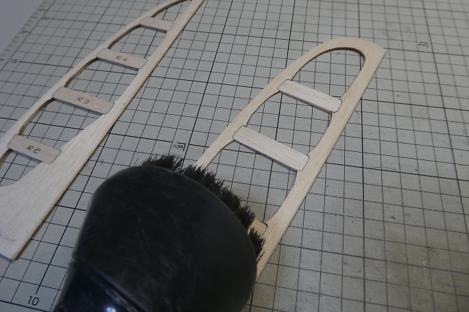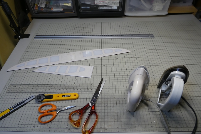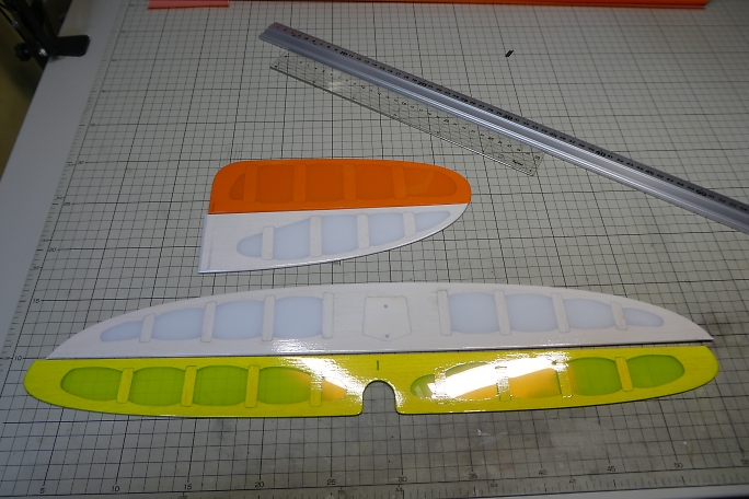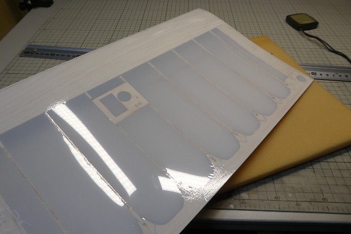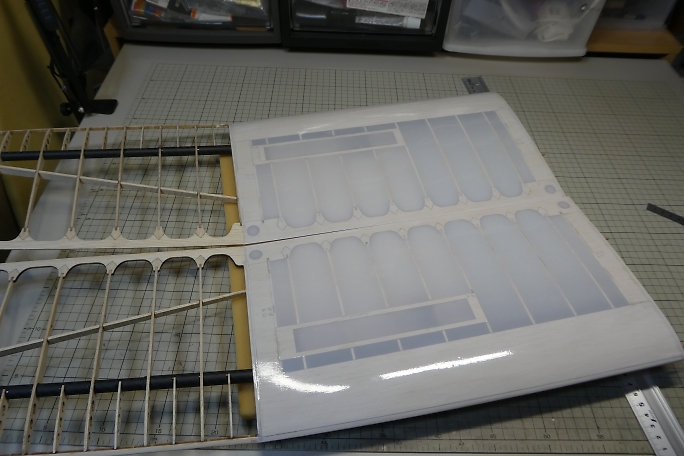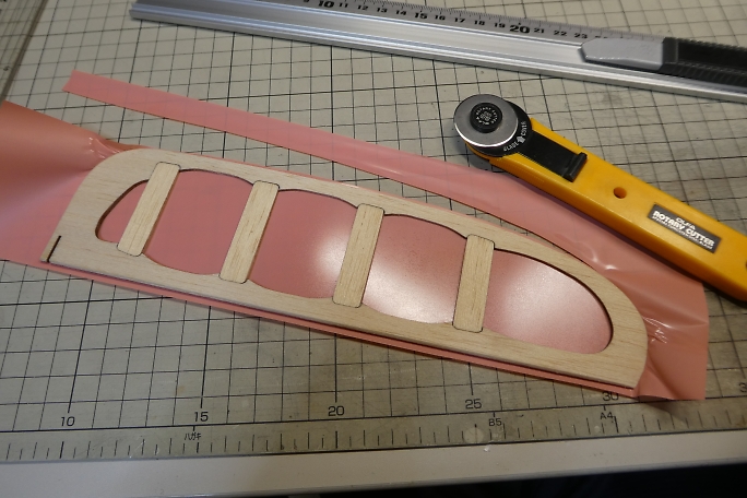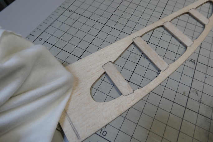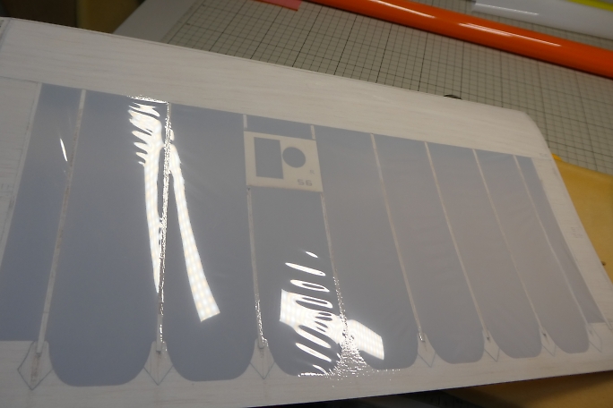 ![]() 主翼一段目のフイルム貼りです。 掃除機で粉やゴミを吸い取った後に、ウエスで拭き上げます。 リブの接着面も 一枚ずつ拭いておきます。 ![]() 裏面から貼り始めます。 フイルムの張力による変形を防ぐ為、上面を貼り終わるまで弛みは取らないでおきます。 ![]() 上面が貼り終わったら下面の弛みも取ります。 ![]() 主翼一段目が貼り終わりました。 |