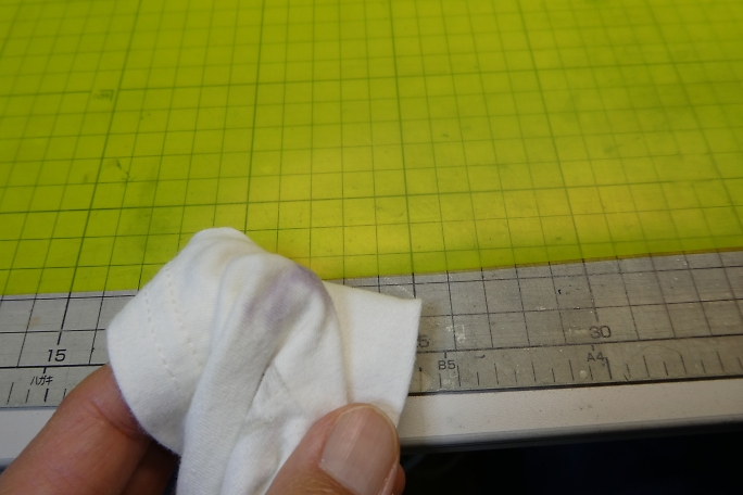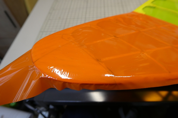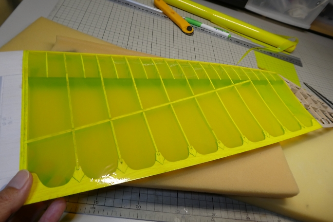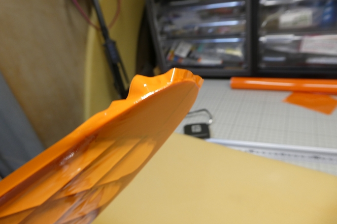 ![]() ![]() 二段目、三段目も掃除機を掛けて、粉やゴミを吸ってからからウエスで拭き上げます。 ![]() 二段目、三段目は前縁、後縁共に円弧を描いていて、定規では切り取れません。 ロータリーカッターを使用しますが、 カットラインを描くのに思い立って作ったツールを使用します。 端から5ミリの所に穴が開いていて、端を後縁に当てて、穴にボールペンを刺して線を引くと後縁から5ミリ離れた所に 線が引けます。 ![]() ![]() 線に沿ってロータリーカッターでフイルムをカットします。 ![]() ボールペンで書いた線はアルコールで拭いて消しておきます。 ![]() 下面から貼り始め、弛みはそのままにしておきます。 ![]() 上面を貼った後に全体の弛みを取る様にします。 |