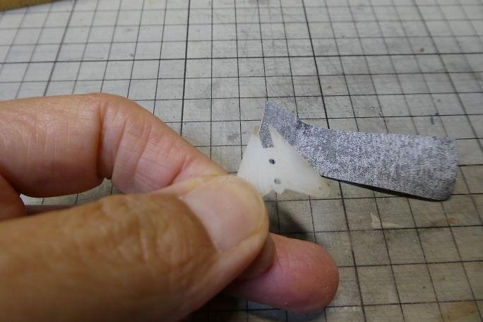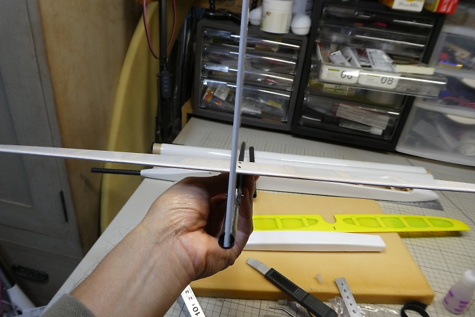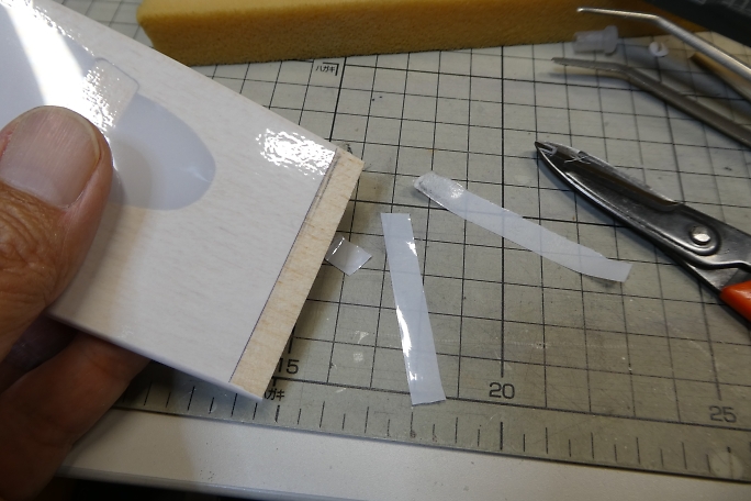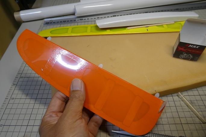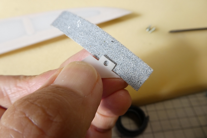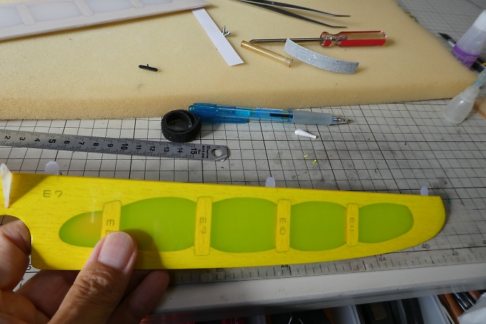 ![]() 垂直尾翼の接着部のフイルムを剥いでおきます。 フイルムを剥いだら、残った方の切り口にアイロンを当てて、再密着 させておきます。 ![]() 水平尾翼をマウントに固定して、水平尾翼とのアライメントを見ながら垂直尾翼をテールブームに接着します。 テール ブームとの接合部はもちろん、垂直尾翼の底部とテールブームの接地部にも低粘度瞬間接着剤を流しておきます。 ![]() ラダーホーンの接着部をサンディングして足ツケをして、硬化促進剤で拭いておきます。 硬化促進剤はロックタイトの712 を使用します。 ![]() ラダーホーンの接着部のフイルムを剥いでおきます。 ラダーホーンがオーバーラップする部分があるので、その部分の フイルムも剥いでおきます。 切り取ったら切り口にアイロンを当てて、周囲を再密着させておきます。 ![]() ラダーホーンとシートヒンジを接着します。 ![]() ラダーのヒンジを垂直尾翼に差し込んで、動作確認をしたら垂直尾翼側のヒンジに低粘度瞬間接着剤を流して接着 します。 隙間に低粘度瞬間接着剤が回ってしまうので、コピー用紙を切った物を差し込んで、回り込んだ瞬間接着剤 を吸い取ります。 フイルム同士が接着されると、動きがとても悪くなってしまいます。 ![]() エレベーターホーンの接着部をサンディングして足ツケをし、硬化促進剤で拭いておきます。 硬化促進剤はロックタイトの712を使用します。 ![]() エレベーターホーンを接着する部分のフイルムを剥ぎます。 切り取ったら切り口にアイロンを当てて、周囲を再密着 させておきます。 ![]() エレベーターにエレベーターホーンとシートヒンジを低粘度瞬間接着剤で接着します。 ![]() 水平尾翼にエレベーターのヒンジを差し込み、低粘度瞬間接着剤を流して接着します。 隙間に低粘度瞬間接着剤が回って しまうので、コピー用紙を切った物を差し込んで、回り込んだ瞬間接着剤を吸い取ります。 フイルムの張力でエレベーターが変形してしまい、修正に手間取りました。 ヒンジラインが真っ直ぐでは無くなって しまいました。 |