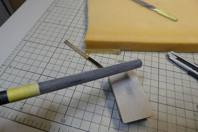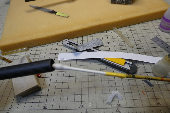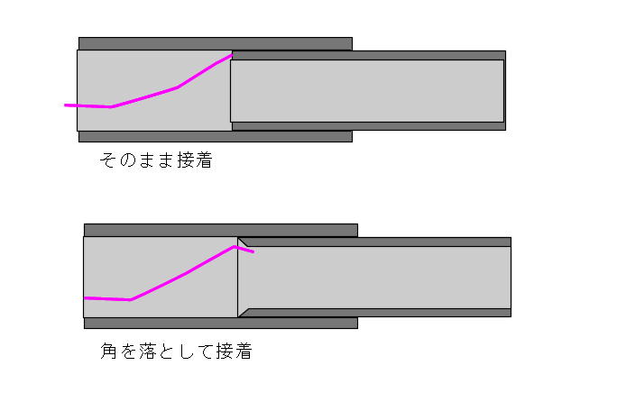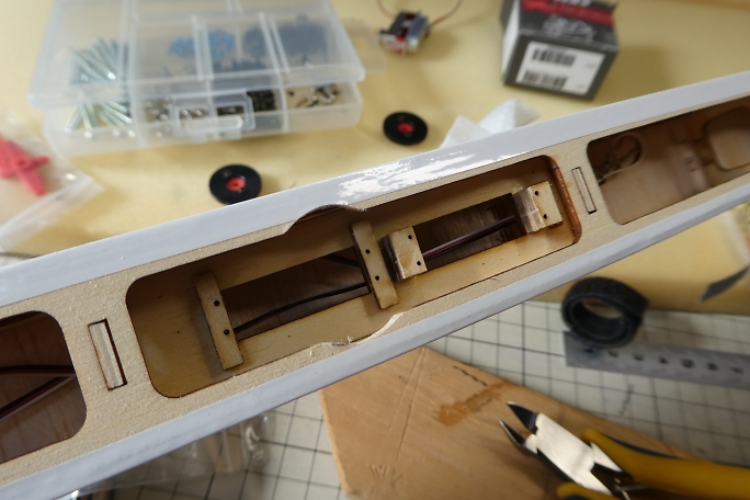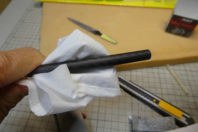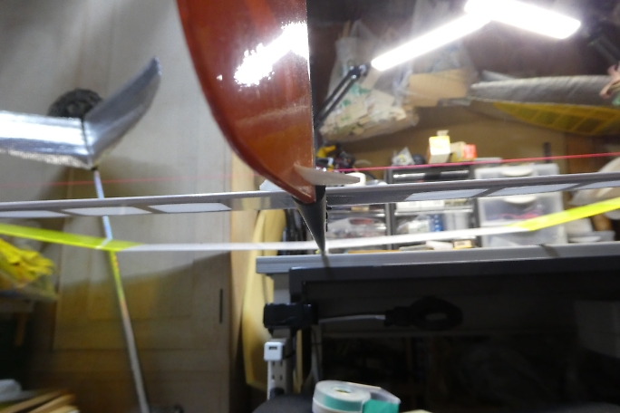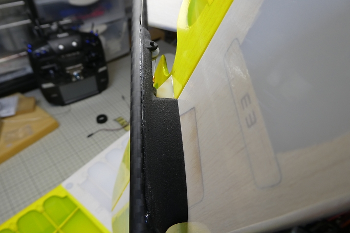 ![]() テールブーム、差し込む方の接着部をサンディングします。 接着しないところまで削ると、見栄えが悪いので、 マスキングテープで養生をしています。 接着部は図面より95ミリとしています。 取説には重心位置をブームの長さで調整して、ノーズバラストは乗せない方針のようでしたが、水平尾翼容積優先で 作業を進めます。 ![]() サンディングした部分を硬化促進剤で拭いておきます。 ![]() 接着されるパイプ内も硬化促進剤で拭いておきます。 綿棒では接着する長さ全部に届かないので、手元にあった筆 の軸で長さを延長しました。 ![]() 主翼を取り付け、主翼の両翼端に水糸を張って、水平尾翼とのアライメントを取り、パイプの繋ぎ目に低粘度瞬間接着剤 を流して接着します。 毛細管現象で接着剤は隙間に吸い込まれますので、吸い込まなくなるまで注入します。 ![]() 今回、きむらクラフト機では図の上の状態になっているのですが、リンケージワイヤーを通す時に角に引っかかって、 リンケージを施工するのに時間が掛かってしまいました。 接着前に、中に入れる方のパイプの内側の角を落としておくことで、かなり時短ができたのでは、と思っています。 |