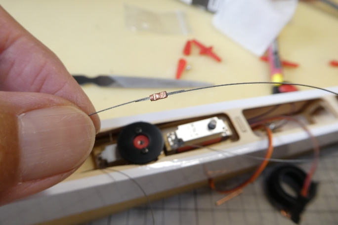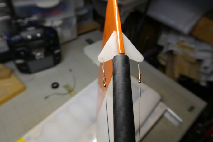 ![]() リンケージワイヤーカシメ用の銅パイプを5ミリでカットしておきます。 ![]() ラダーリンケージは1本でやりたかったのですが、ワイヤーを通すのに難儀、2本通してカシメで繋げることになりました。 ![]() サーボ側はプーリーに一周巻き付けています。 ワイヤーの腰が強く、弾けてしまうので、リンケージ作業中はマスキング テープで仮止めをしておきました。 ![]() ラダーホーンにテンションを掛けてカシメ、カシメ部に低粘度瞬間接着剤を少量付けて固定します。 ニュートラルはプーリー部のワイヤーを滑らせて合わせています。 プーリーの前後二カ所にスーパーXを爪楊枝で少量塗布して滑り止めにしています。 ![]() エレベーターリンケージは奇跡的にもワイヤーが通ったので1本でやっています。 エレベーターリンケージ補助パーツに テンションを掛けてワイヤーをカシメます。 プーリーにワイヤーを通すのを忘れない様にします。 カシメ部には低粘度瞬間接着剤を少量付けて固定します。 ![]() 水平尾翼を取り付けて、ニュートラルをサーボのプーリー側で合わせます。 プーリーの前後二カ所にスーパーXを爪楊枝で少量塗布して滑り止めにしています。 ![]() ラダー、エレベーターサーボのリンケージ具合です。 |