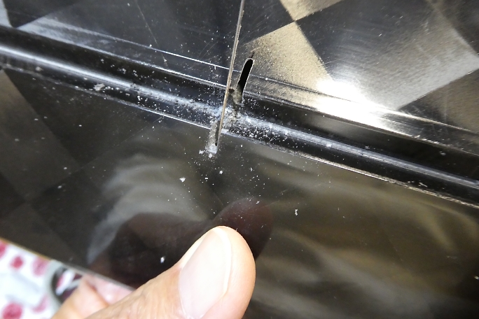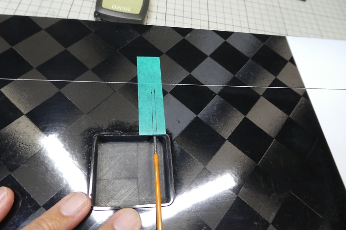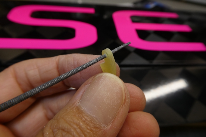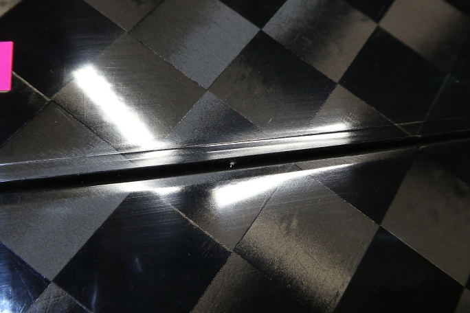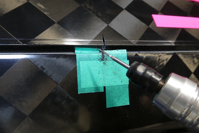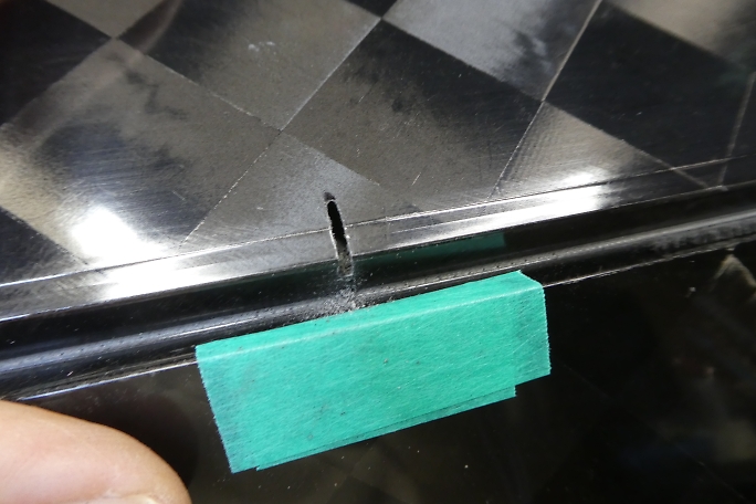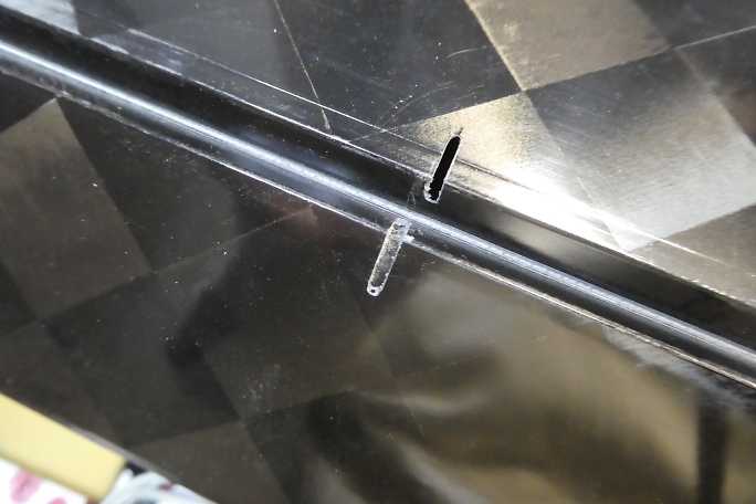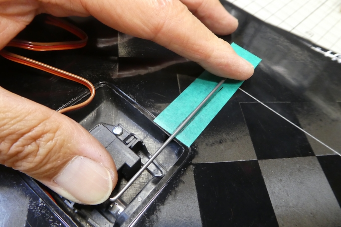 サーボホールに作り付けられているロッド穴を基準にすると、サーボベッドのベアリング部分を一番端まで寄せた位置と なります。 その位置で、サーボホーンにロッドを取り付けて、サーボと直角になるようにした状態で、ロッド位置を マーキングします。 ![]() この下をロッドが通ります。 サーボホールにはロッド穴の入り口は出来ていますが、コアは未加工なので、ユーザー側 で貫通させる必要があります。 ![]() 細い棒ヤスリで、マーキングした通り道をガイドに穴を開けて行きます。 上面に貫通させてしまわない様に、上寄り (主翼下面寄り)を意識します。 ![]() ヤスリの先が後縁から顔を出しました。 ![]() ロッド取り出し口の位置をマーキングします。 ヤスリが顔を出した位置から後縁材から直角にマーキングします。 ![]() マスキングテープで養生をして、上面スキンを切り開いていきます。 前作のSENSEのデータから、8ミリ切り込みます。 また、幅は2ミリとします。 ![]() リューターで切り開いた後にヤスリで整形が加工の終わった取り出し口です。 |