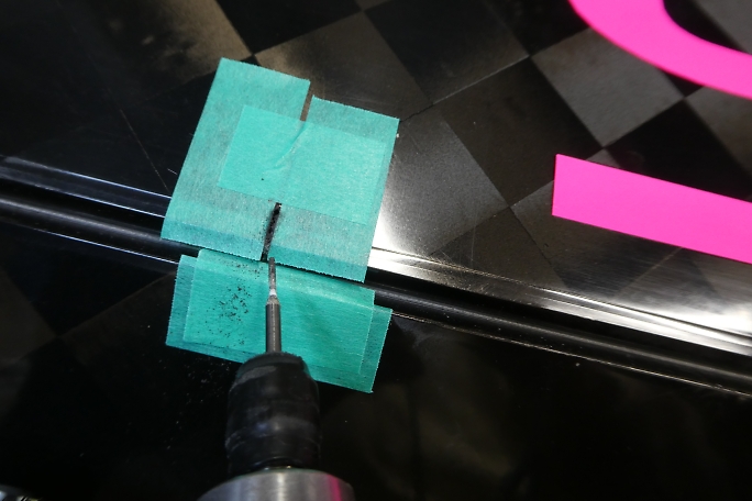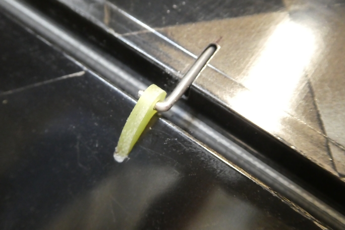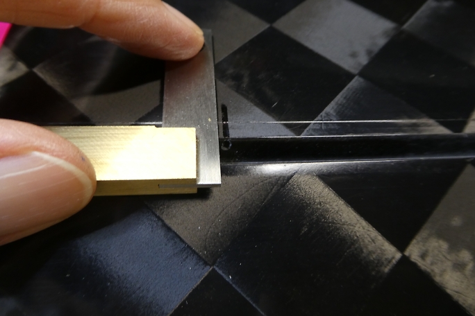 ロッドにフラップホーンを取り付けて、フラップにフラップホーンの取り付け位置をマーキングします。 ![]() マーキング位置から、フラップホーンの取り付けスロットの切り欠きをマーキングします。 前作のデータから、長さは5ミリ、 仕上がり幅は2ミリとします。 ![]() リューターでマーキングに沿って切り欠きます。 ビットは万能なダイアモンドドリル刃です。 サイズは数種類用意しています。 ![]() フラップ内のコアを掻き出します。 ハードポイントを作りつつ接着するので、サイズキッチリにする必要はありません。 ![]() 仕上がったフラップホーン用のスロットです。 ![]() ![]() フラップホーンの収まりを確認しておきます。 この手のリンケージでは、作り付けてしまうと、ロッドの取り外しはほぼ 不可能になりますので、確認はしっかりと行っておきます。 |