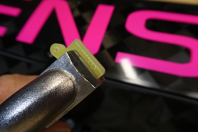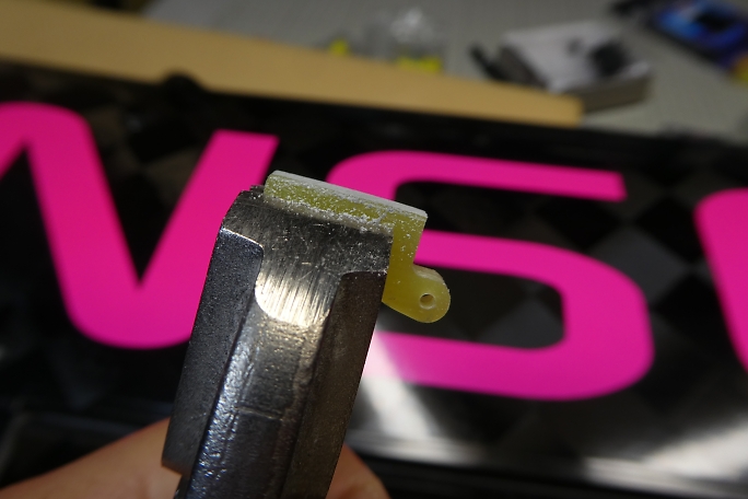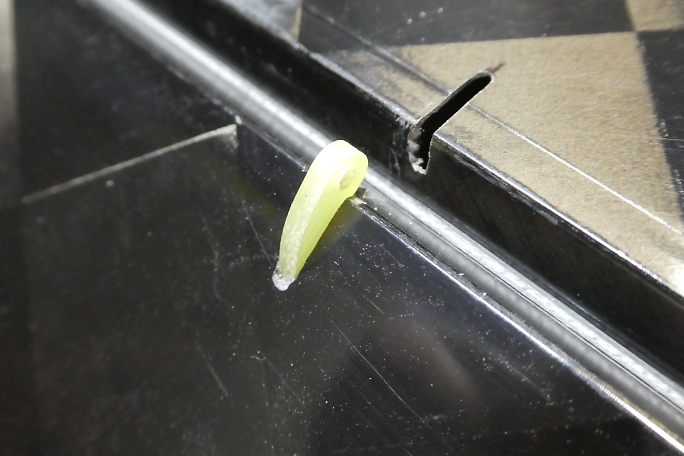 ![]() フラップホーンを2枚バイスプライヤーで重ねて、底面から1ミリの所にケガキを入れます。 この高さで、フラップの角 とロッドの中心がほぼ一致します。 ![]() 加工の終わったフラップホーンです。 ![]() フラップホーンの穴は小さめに開けられているので、ヤスリで穴をガタ無く渋くなく動くサイズに調整します。 |