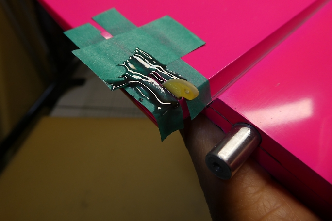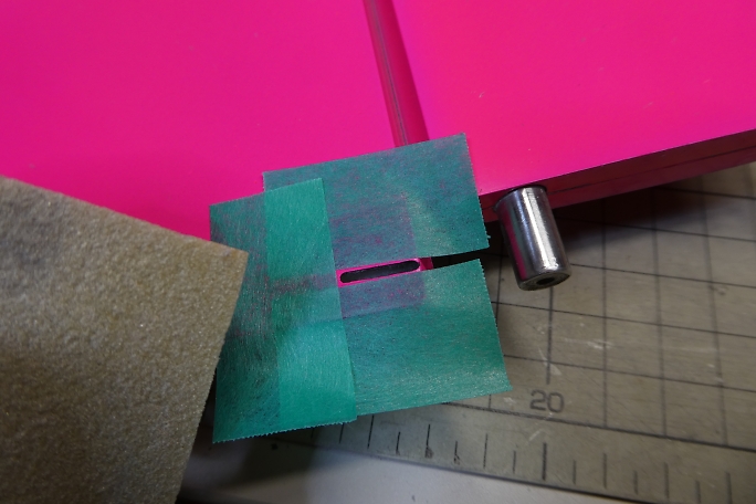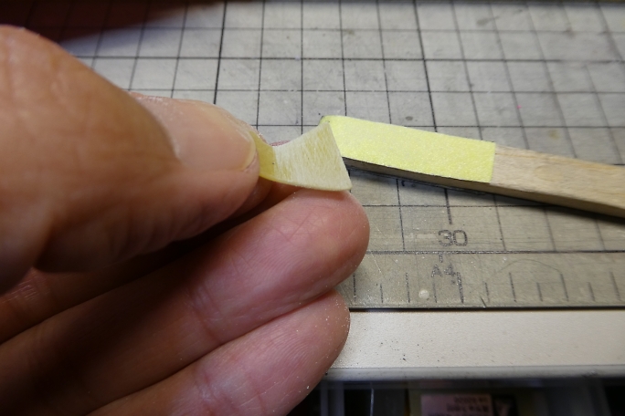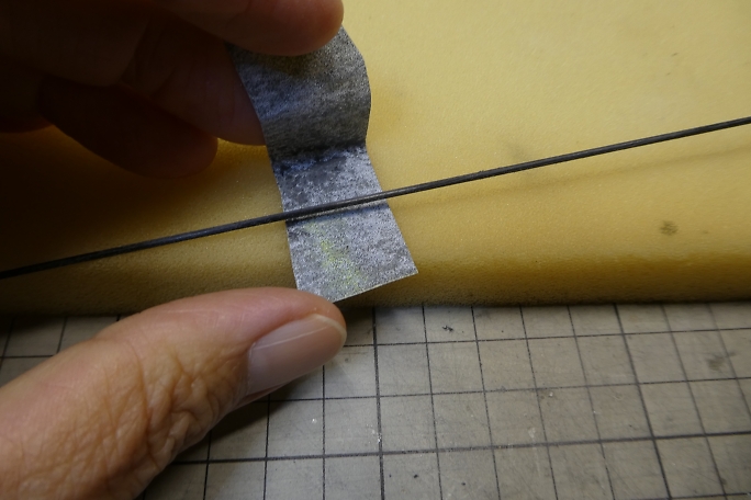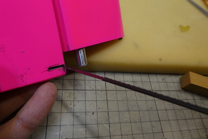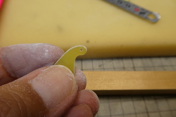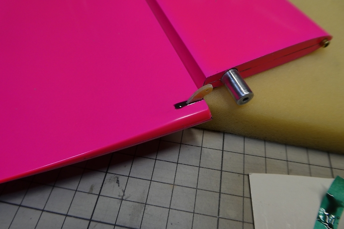 垂直尾翼を胴体に組み付けて、ラダーホーンの取り付け位置をマーキングします。 ![]() マーキングに沿ってラダーにマスキングテープで養生をして、ラダーホーンの取り付け穴を開けて行きます。 ![]() 中のコアを反対側のスキンまで掻き出します。 ![]() ![]() ラダーホーンはエンドミルの切り出しで、角が立ったままだったので、角を落とし、接着部はサンディングして足付けをして おきます。 ![]() 加工したラダーホーンのスロットから1ミリ離してマスキングテープで養生をして、スロットの周辺をサンディングして 足ツケをしておきます。 ![]() マスキングテープの養生をスロットから0.5ミリに貼り直し、スロットにカーボンパウダー入り5分エポキシを充填 します。 ![]() はみ出てくるカーボンパウダー入り5分エポキシを取り除きながら、ラダーホーンを沈めます。 ![]() マスキングテープは直ぐに剥がしておきます。 |