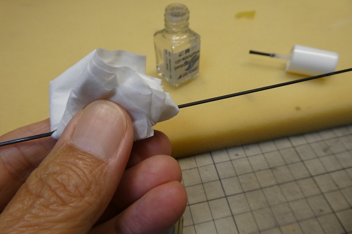 ![]() エレベーターリンケージは全く問題が無く、スルスルと動いたのですが、ラダーリンケージのアウターチューブの取り付け 時のカーブがきつくて、動きが悪いです。 アウターチューブの修正は出来ないので、ロッドの加工で改善を図ります。 ロッドの表面がデコボコしていたので、サンディングして平滑に仕上げます。 少し動きが良くなりました。 ![]() 更にテフロンコーティング剤を塗って仕上げます。 |