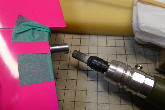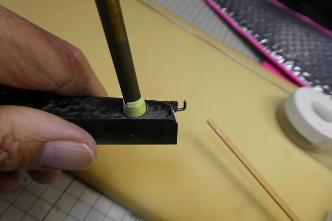 垂直尾翼はアルミのアライメントピンを胴体に差し込む仕様ですが、全く入りません。 胴体の穴をサンドペーパーを巻き付けた丸棒で削って広げます。 ![]() 垂直尾翼が入る様になったので、アライメントピンをバフで磨いておきます。 |