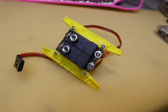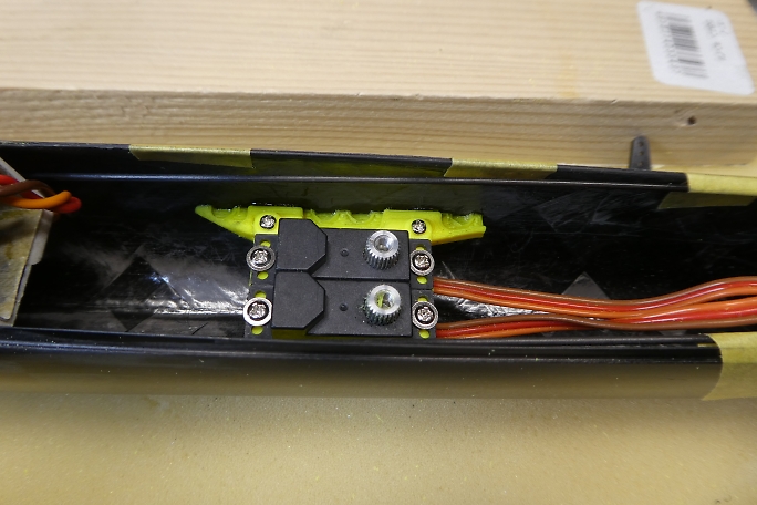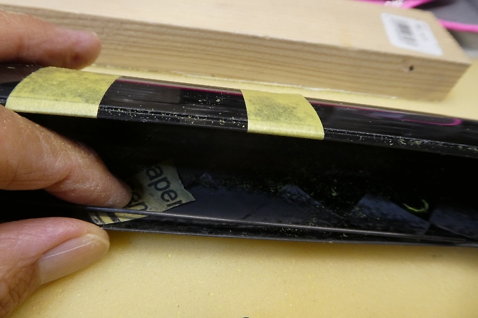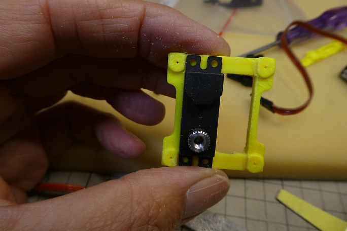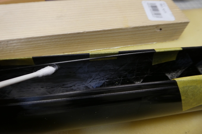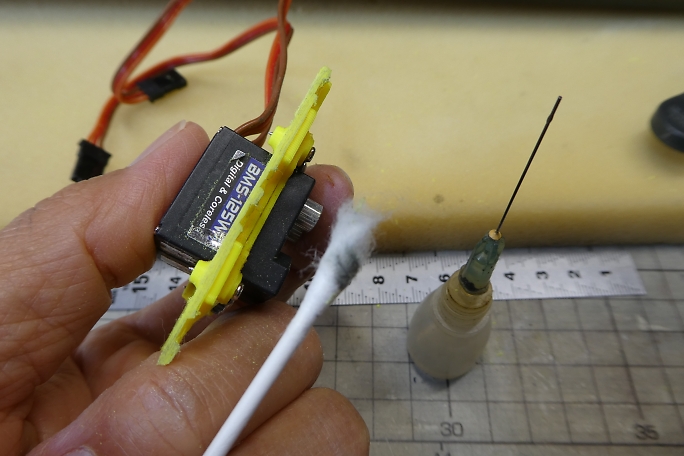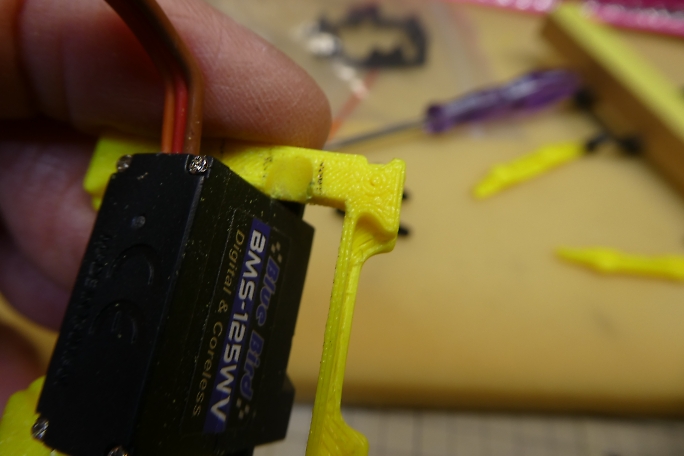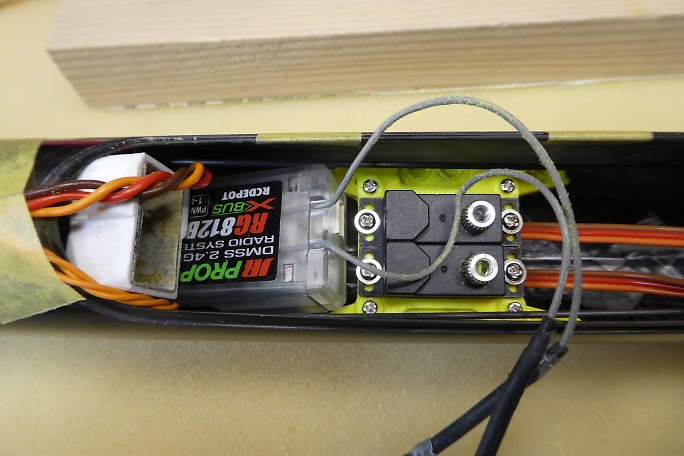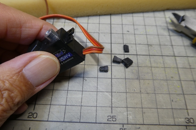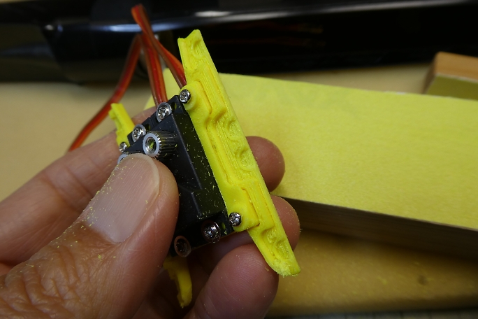![]() エレベーターホーンの取り出し口が狭くて、フルアップ側で、エレベーターホーンのボールリンクが胴体に干渉します。 取り出し口を内側から削って広げておきます。 |
