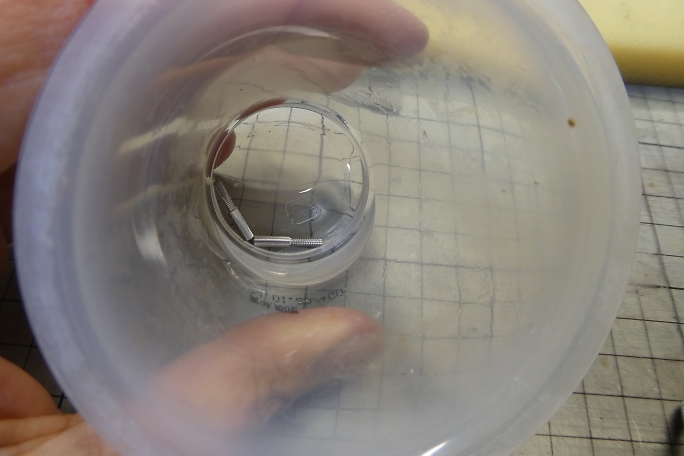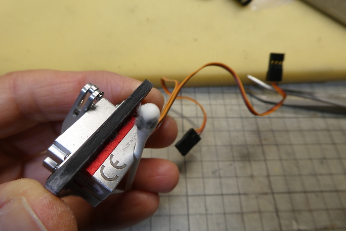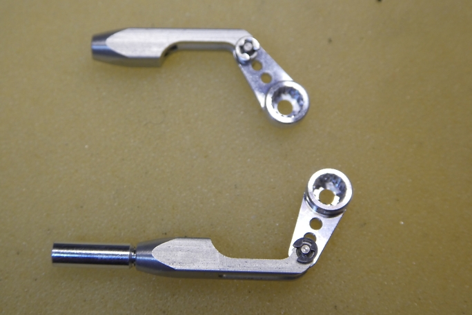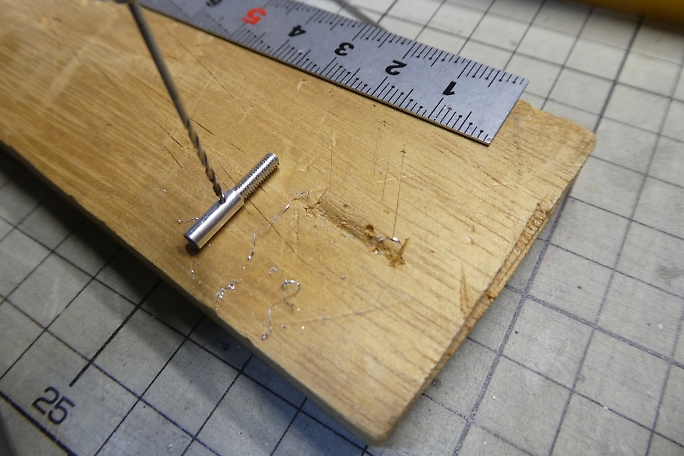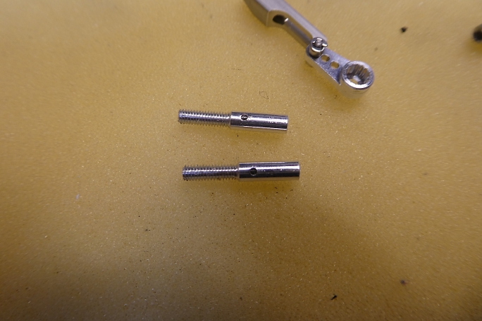 ロッドエンド、サーボホーンを組み立てておきます。 ロッドエンドとサーボホーンを繋ぐピンは、極小のEリングで固定 します。 ピンセットでつまんだところ、弾いてしまって、飛んでしまったEリングを探すのに10分を費やしました。 ![]() ロッドエンドには空気抜きのあなを開けます。 1ミリのドリルで、端から7ミリの位置です。 ロッドエンドの穴の深さは8ミリあります。 ![]() 穴開け加工の終わったロッドエンドです。 ![]() アルコールで脱脂、洗浄をしておきます。 |