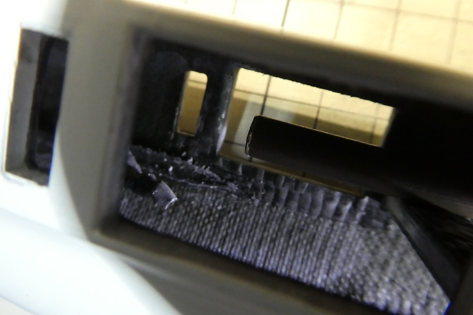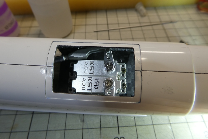カンザシ穴から胴体内を見た写真です。 リンケージロッドの位置がおかしく、サーボホーンにロッド届きません。 真鍮パイプに刃を付けた物で、ロッドのアウターチューブを100ミリ程剥がして、適正位置に接着し直します。 ちなみに、アウターチューブはシュリンクさせていない3ミリのシュリンクチューブでした。 |