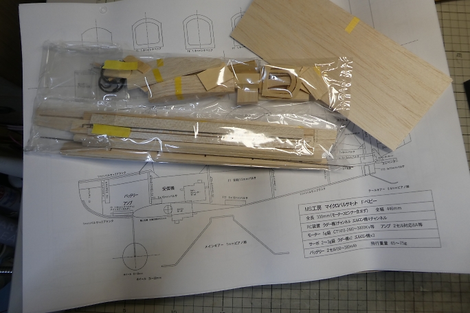 キットの全容です。 ありがたい原寸図の図面と手切りのパーツ類です。 胴体などのプランク材や尾翼の部材は、 1枚シートで製作側が切り出す必要があります。 メインギヤもピアノ線が同封されているだけなので、自分で曲げる必要があります。 |