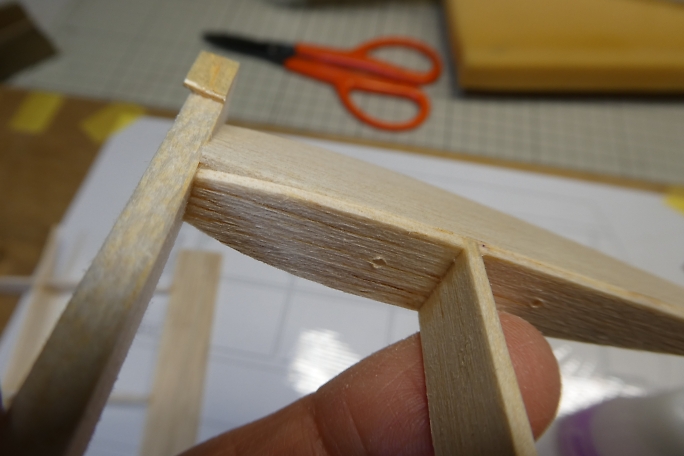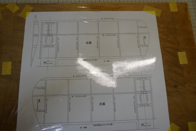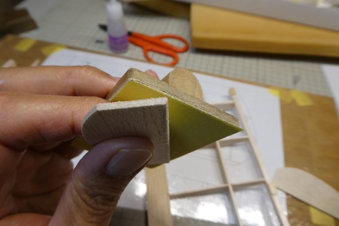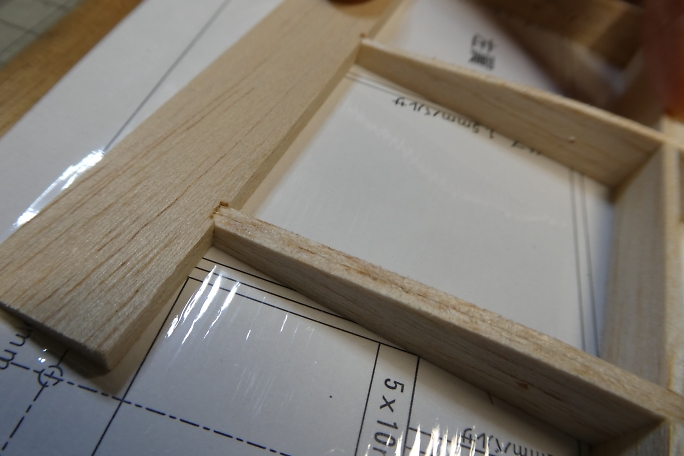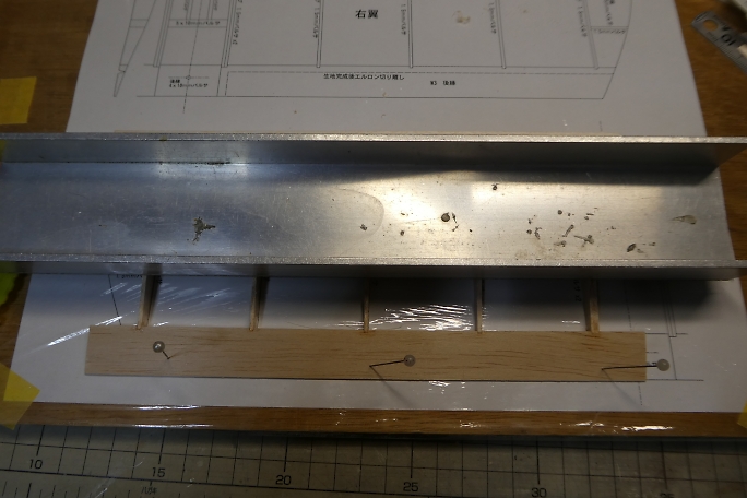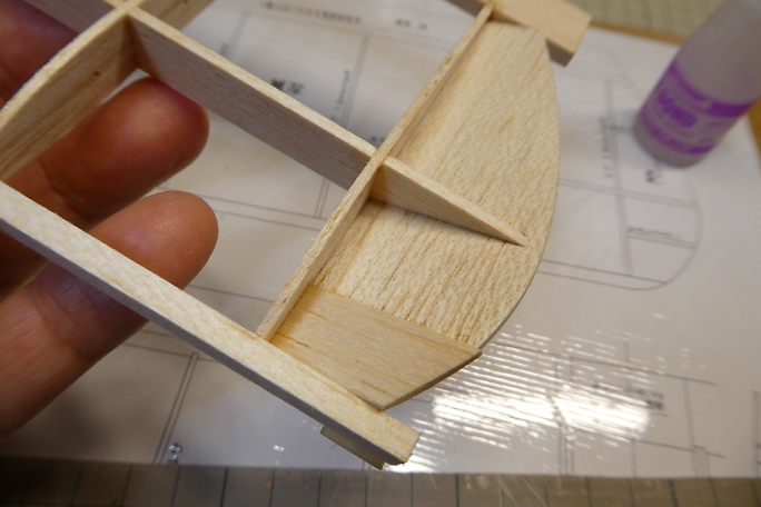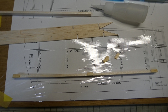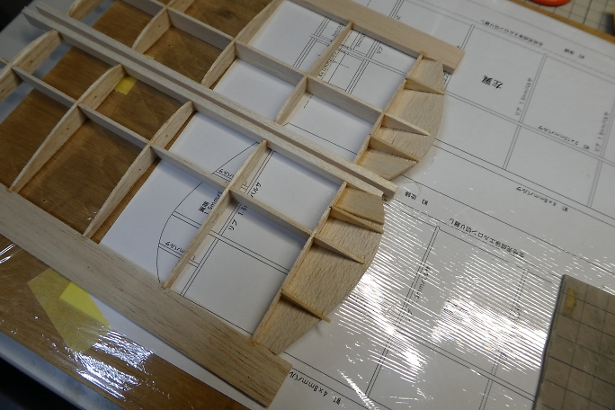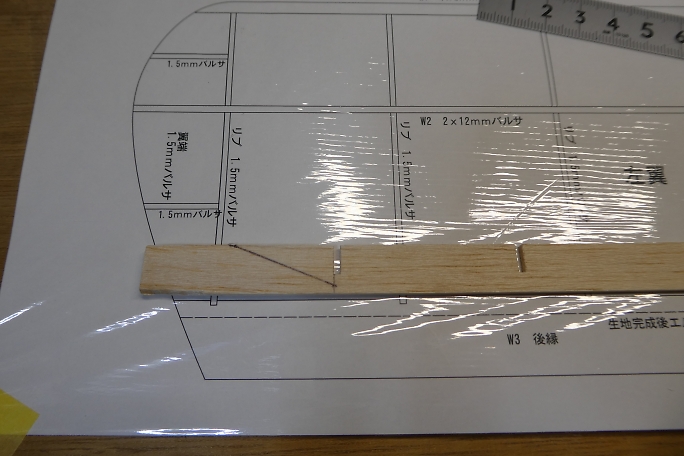 ![]() 定盤の上に図面、ラップと敷いて、製作の準備です。 リブの溝だけ加工済みになっているスパーに翼端材取り付けの ために斜めにカットします。 ![]() 翼端材の厚みを考慮した加工が必要です。 ![]() 前縁材の下に、1ミリのスクラップバルサで足を接着しておきます。 前縁の持ち上がり部分があるためです。 ![]() 仮組みをした所、後縁材がリブ後端より少し厚かったようです。 ![]() サンディングで厚みを調整しました。 ![]() 図面上で低粘度瞬間接着剤を使って組み立てていきます。 ![]() 組み上がったら、軽く重しをして一晩ゆがみ取りの為に放置します。 |