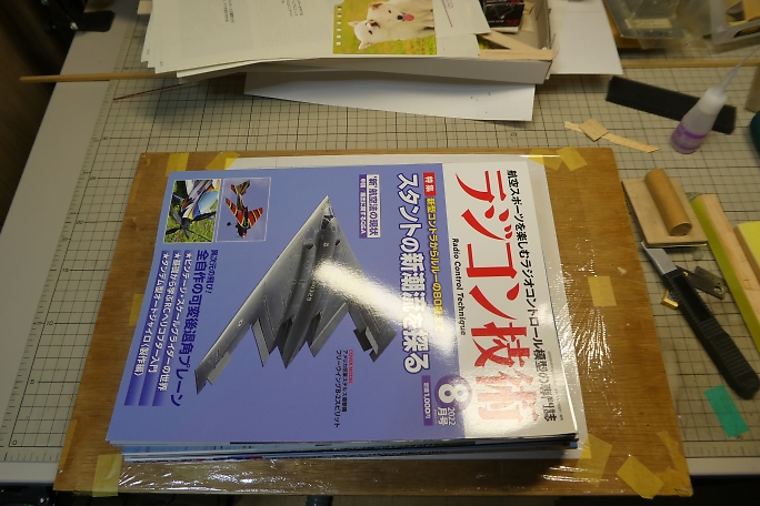 側板に補強材を貼り合わせます。 面積の多いパーツにはタイトボンドを使用します。 薄く塗り広げて、貼り合わせます。 胴枠位置のマーキングはメーカーで施したものです。 ![]() 水分のあるタイトボンドなので、乾燥時の反りを押さえる為、貼り合わせ後一晩は重しの下に置きます。 ラジ技誌3〜4 冊程度の重しです。 ![]() 補強材の貼り終わった側板です。 |