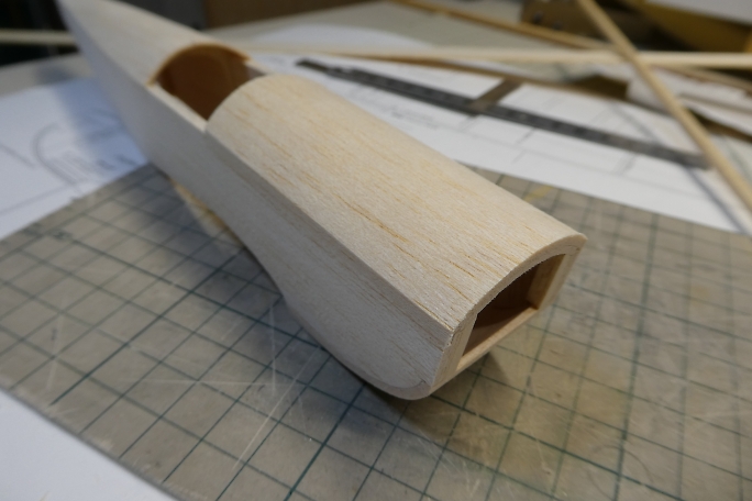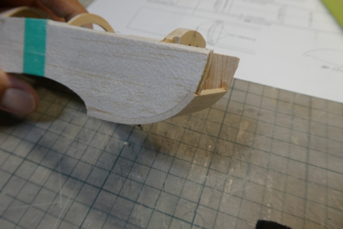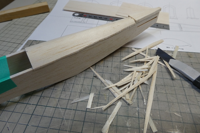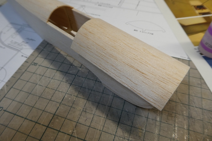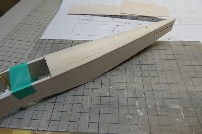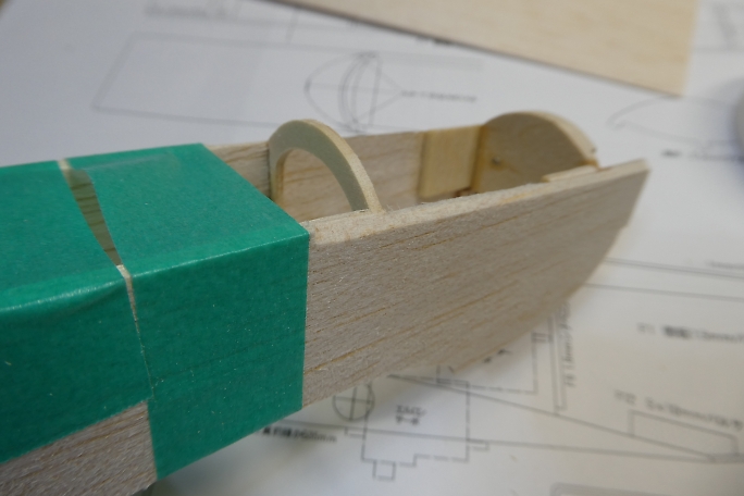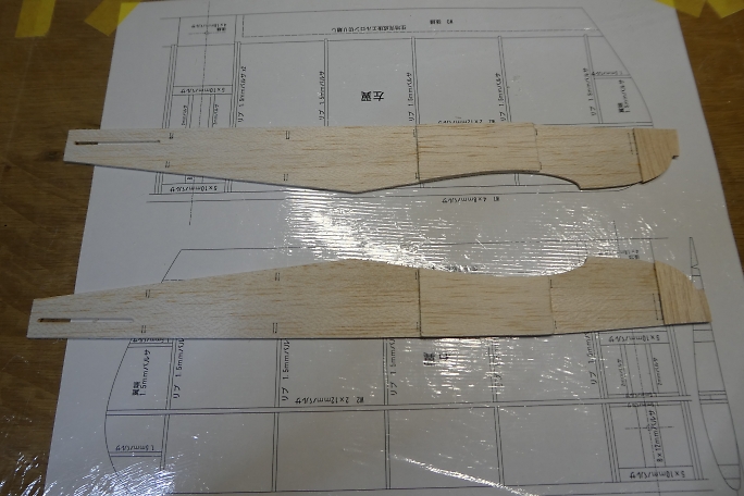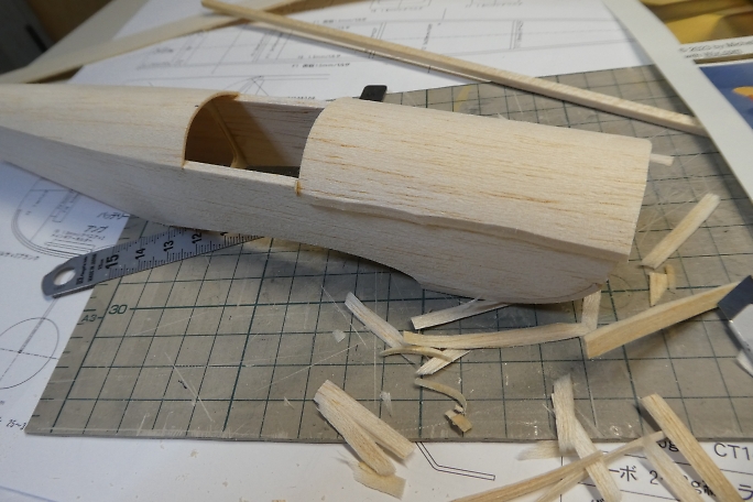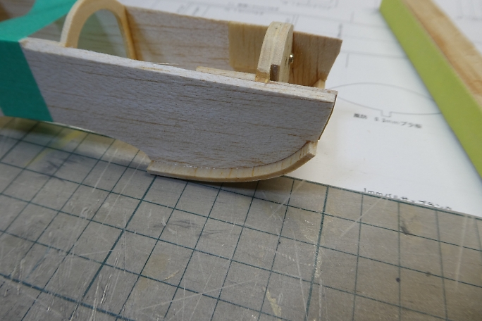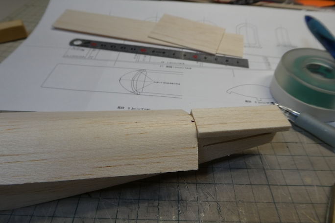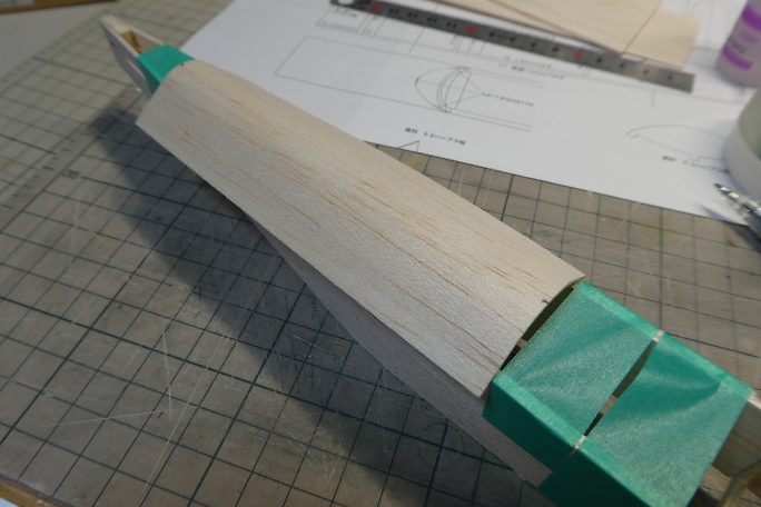胴体前部、プランクの為に、側板を胴枠に沿った傾斜に削ります。 削らない部分を保護するため、マスキングテープで養生をします。 ![]() 胴体後部の上面プランクの為に、前部プランクと同様に加工をします。 ![]() 胴体後半の上面をキット付属の1ミリバルサでプランクをします。 胴枠に沿わせたら、隙間に低粘度瞬間接着剤を流して接着します。 ![]() 垂直尾翼の取り付け台は別パーツとなっていて、上面プランクに合わせて整形するスタイルです。 ![]() ![]() カッターで荒削りをしたのち、サンディングで形を整えます。 まだ、角を落とす所まで整形をしていません。 |