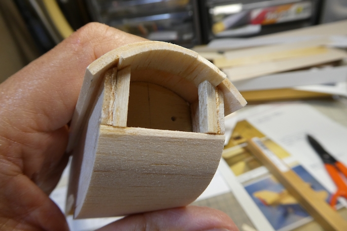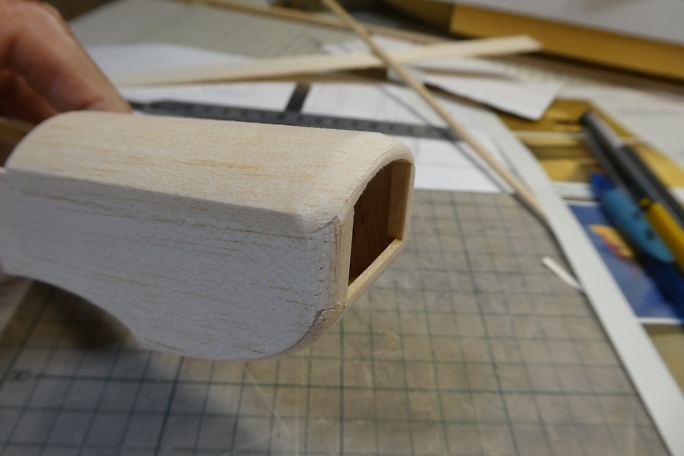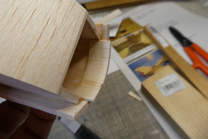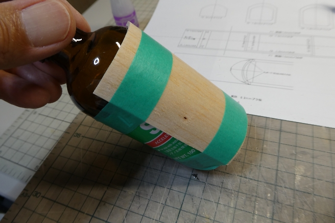 前部の下面プランクはキット指示では1ミリバルサの2枚重ねですが、手持ちの2ミリバルサ1枚で対応しました。 ![]() 下面プランクをはみ出た所をトリミングして、ツライチ程度の整形をしておきます。 ![]() 上面プランクはキット指示では1ミリバルサの2枚重ねですが、こちらも手持ちの2ミリバルサを使用します。 カーブがきつめなので、バルサを湿らせてから、小瓶に巻き付けて癖付けをします。 ![]() 癖付けをした2ミリバルサで上面をプランクします。 接着は低粘度瞬間接着剤です。 ![]() キット指示ではノーズ開口部はプランク材だけですが、味気ないので、1.5ミリバルサを裏に接着、厚みを持たせて 整形出来る余裕を持たせました。 ![]() 開口部側面も3ミリのスクラップバルサを入れて整形の幅を作ります。 ![]() ![]() カッターで荒削りをしたのちに、サンディングして表面を整えます。 ![]() ノーズ部分も削って表情をつけます。 軽く削っただけでも印象が変わります。 |