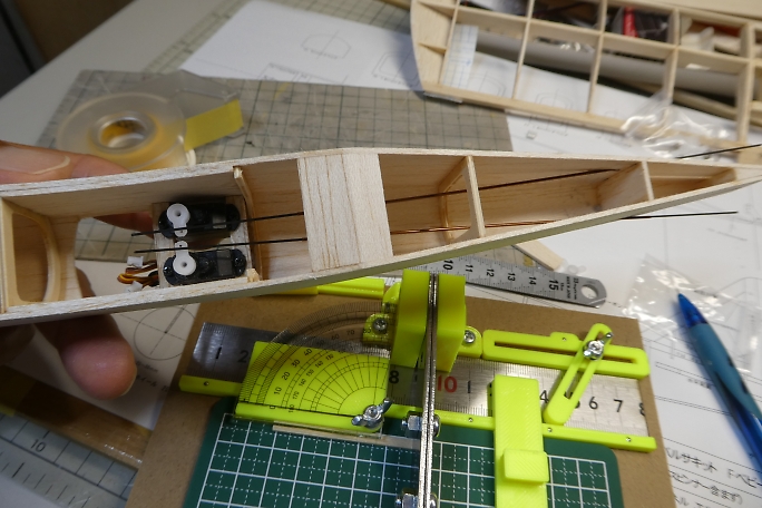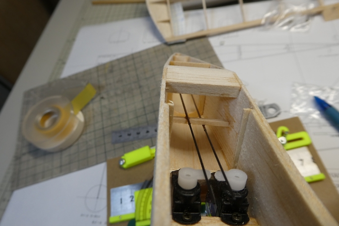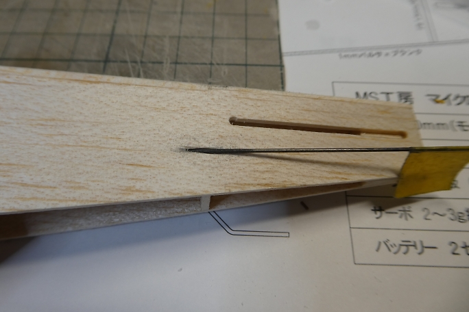![]() リンケージはいつものカーボンロッドにポリイミドチューブのアウターの組合せです。 ポリイミドチューブの取り出し 口を精密ヤスリを使って開けて行きます。 ![]() サーボホーンとリンケージロッドの位置関係を確認します。 カーボンロッドは0.7ミリサイズです。 ![]() ホーンの位置にロッドが来る様に、スクラップバルサでサポートを作り、接着します。 ![]() エレベーターとラダーりリンケージが敷設されました。 |