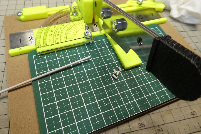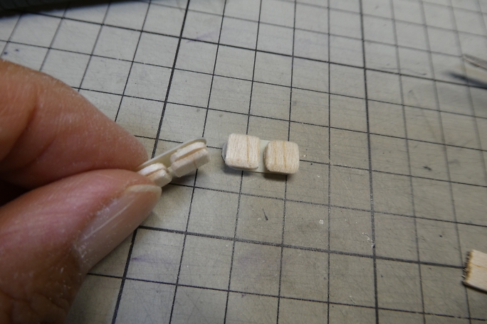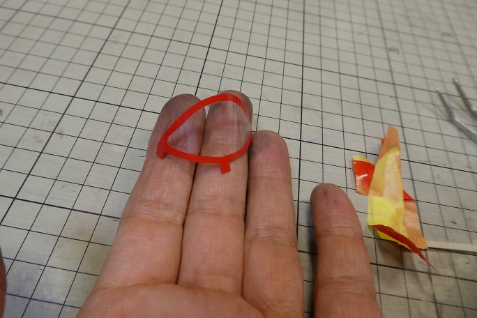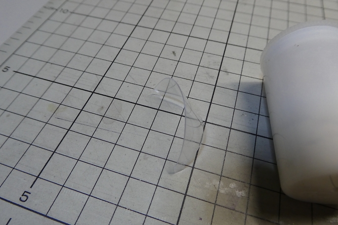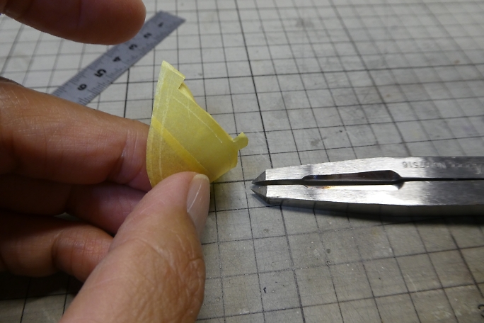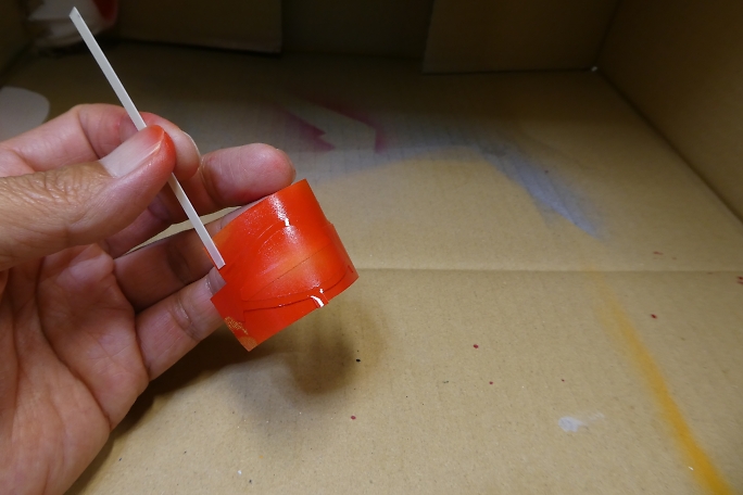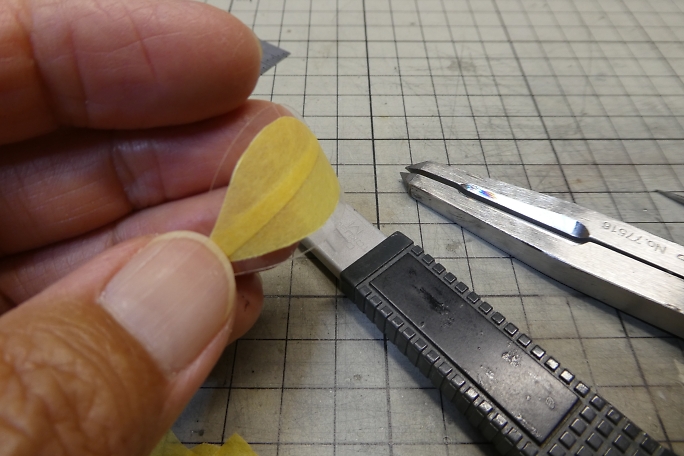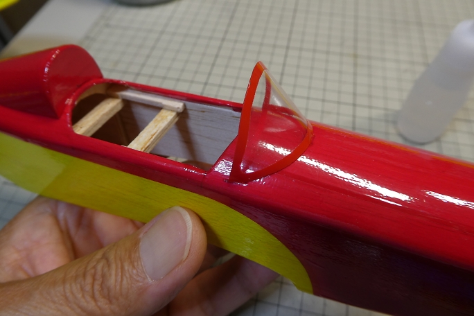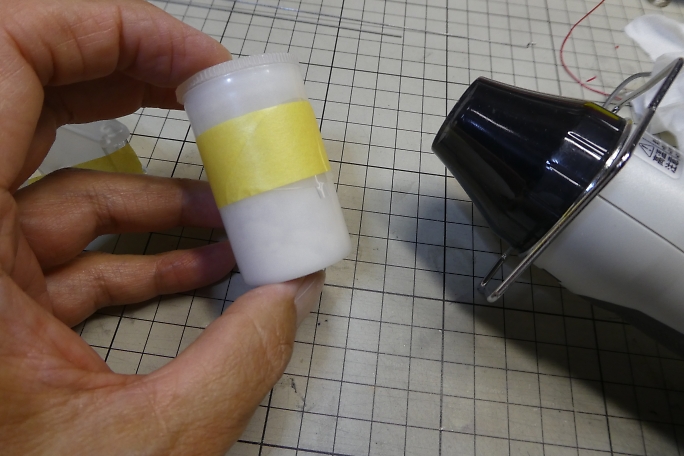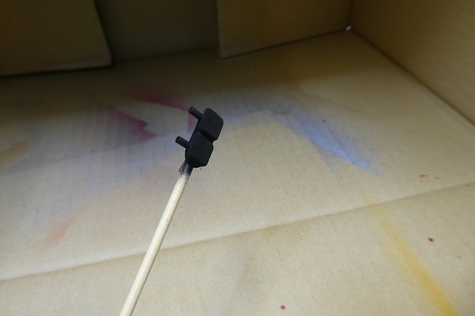 キャノピーが固く、曲げて差し込んだら歪んでしまうので、曲げ癖を付ける事にします。 キャノピーをフイルムケースに 貼り付けて、ヒートガンで加熱します。 ![]() 良い感じに曲げ癖の付いたキャノピーです。 ![]() キャノピーの縁を塗り分けるため、マスキングテープを全面に貼り、2ミリ幅でラインをケガキます。 ![]() ケガキ線に沿って、カッターで切り込み、縁のみマスキングテープを剥がします。 ![]() エアブラシで塗装します。 プラモデル用の水性塗料を使用しました。 ![]() マスキングテープを剥がしてキャノピー塗り分け完了です。 ![]() 胴体に刺して、胴体内から中粘度瞬間接着剤の点付けで接着します。 |