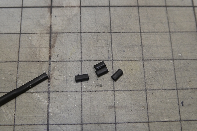 タイヤは買い置きの物です。 ![]() ![]() タイヤを差し込んだら、細かく切ったシュリンクチューブを被せて中粘度瞬間接着剤の点付けで接着します。 |