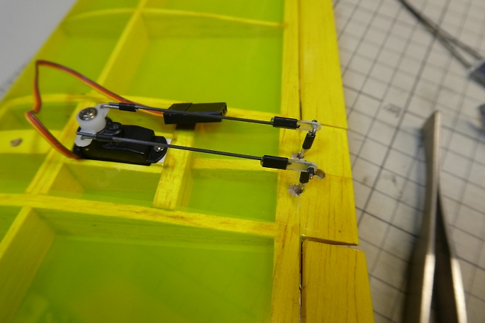 サーボにはL字のロッドエンドを組み付けておきます。 ロッドエンドには、シュリンクさせたチューブを2ミリ幅に切った 物を被せ、瞬間接着剤で接着して抜け止めにしています。 ![]() 作っておいたシュリンクチューブを3ミリ長にカットしておきます。 ![]() 作っておいたエルロンリンケージとサーボを取り付けます。 まだ、サーボ側のロッドエンドとエルロンリンケージの カーボンロッドは接着していません。 ![]() 送信機でニュートラルを合わせて、カーボンロッドとロッドエンドを瞬間接着剤で接着します。 |