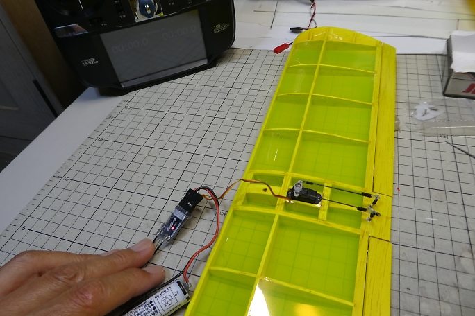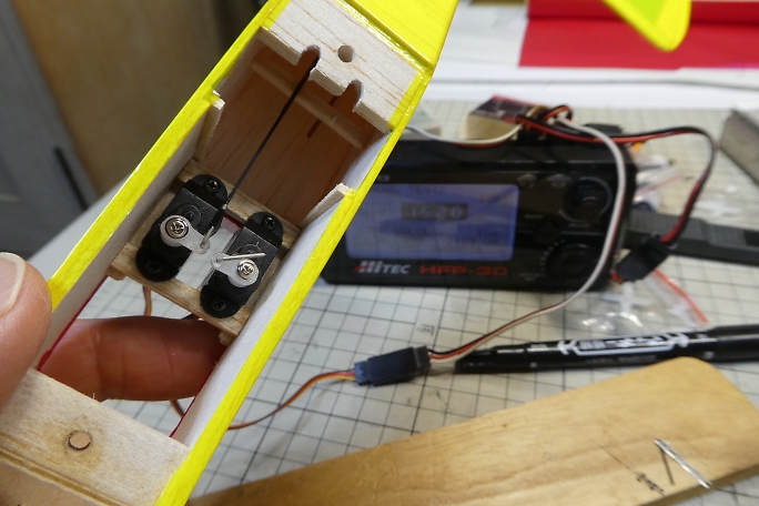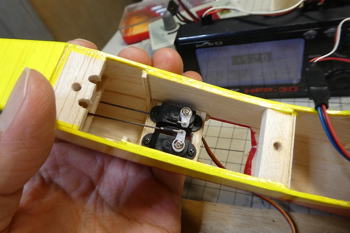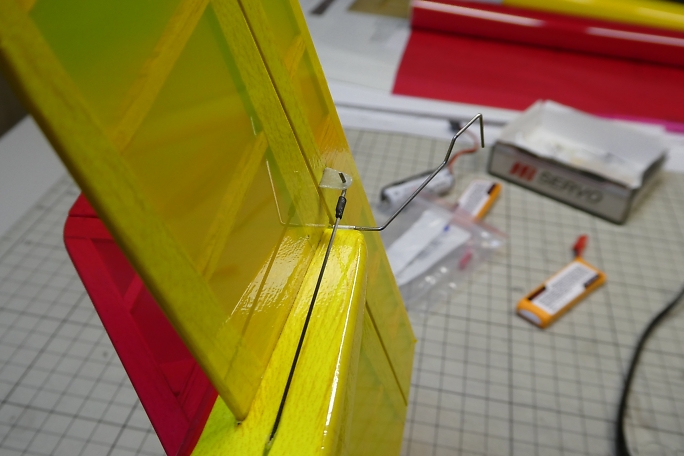 ![]() 胴体にエレベーター、ラダーサーボを取り付けておきます。 ![]() 1520μsのニュートラルとエレベーター、ラダーのニュートラルを合わせて、ロッドの長さを決め、カーボンロッドを カットします。 ![]() サーボテスターでニュートラルを合わせて、ロッドエンドとカーボンロッドを瞬間接着剤で接着します。 ![]() ![]() 動翼側の様子です。 ![]() 完了したエレベーター、ラダーリンケージです。 |