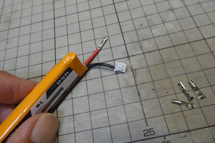 バッテリーのコネクタがJSTk1.5ミリなので、JSTの赤コネクタに交換します。 ショートさせない様に一本ずつ交換していきます。 ![]() 右がコネクタ交換後のバッテリーです。 |