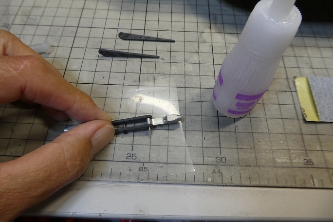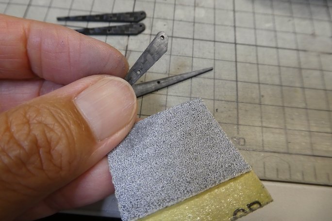 ![]() エルロンホーンは2個繋がった状態での供給です。 切り離して切り口を整えておきます。 ![]() バラバラの状態でサンディングして面取りと足付けをしておきます。 組み立ててしまうとやりにくそうです。 付属のカーボンロッドを余裕を見て10ミリでカットします。 ![]() ロッドエンドをガイドに、ホーンとカーボンロッドを瞬間接着剤で接着します。 ![]() 組み上がったエルロンホーンです。 |